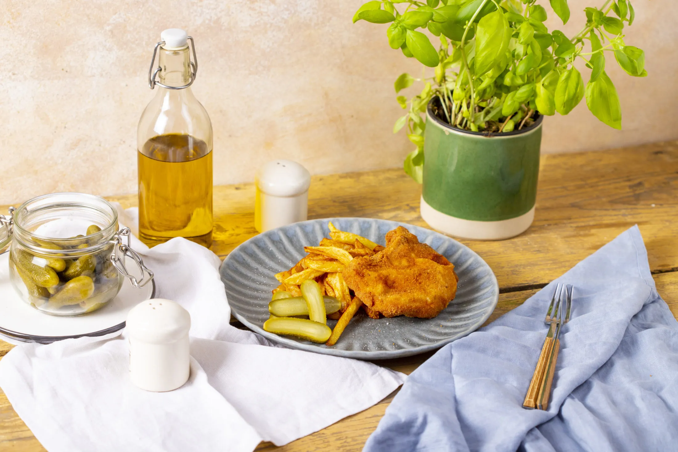 A krumplit megpucoljuk és hasábokra vágjuk, majd kb. 170 fokos olajban aranybarnára sütjük. A krumplikat kiszedjük az olajból és leitatjuk róla a felesleges olajat. A húst ugyanabban az olajban, 3-4 perc alatt szintén aranybarnára sütjük, és ezt is konyhai papírtörlőre szedjük, majd tetszőleges savanyúsággal tálaljuk.
