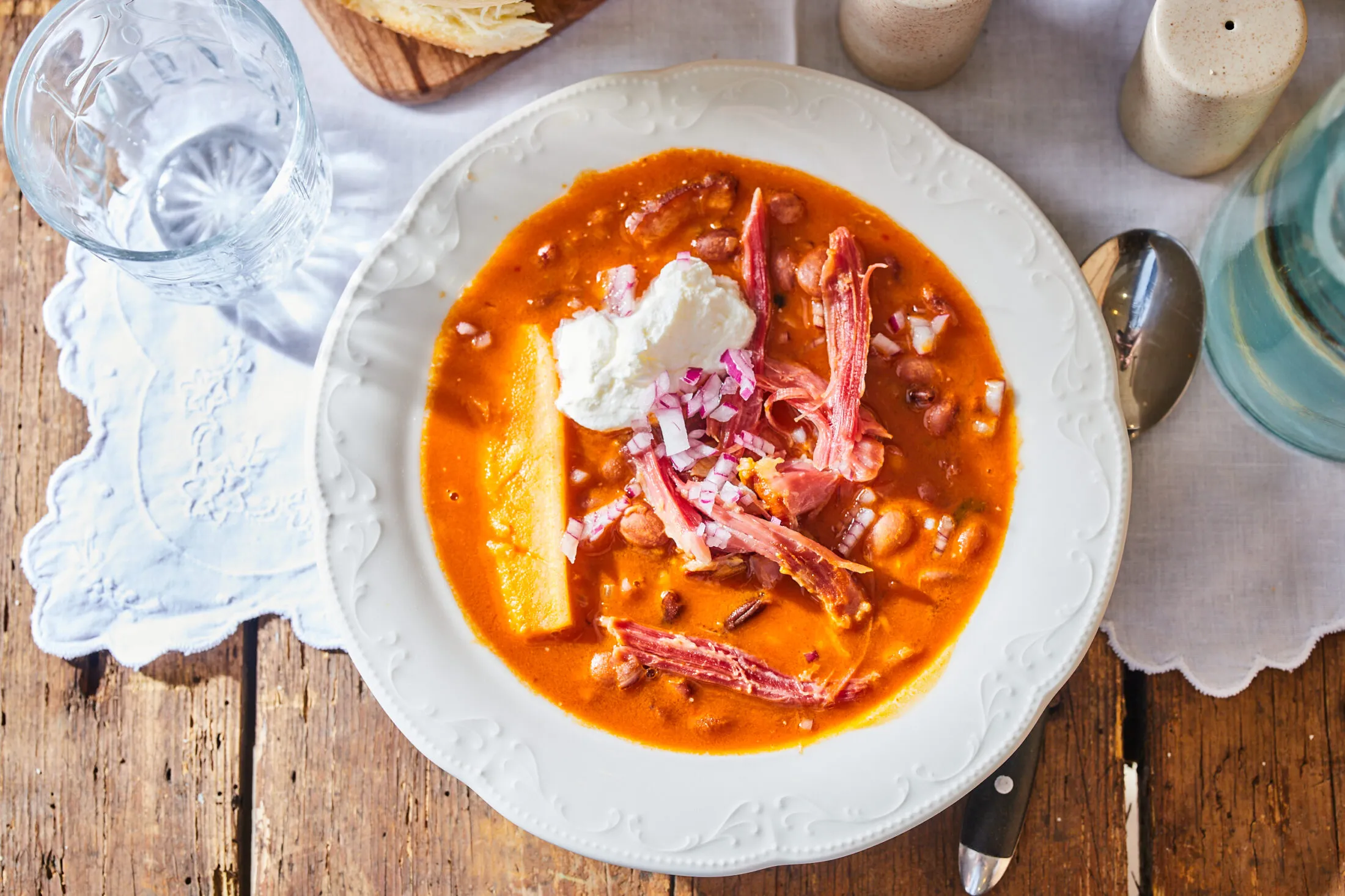 1,5 óra főzés után a leveshez hozzáadjuk a lecspegtetett babot, a paradicsomot, a zeller zöldjét, a petrezselymet, a kb. 5 cm-es darabokra vágott kolozsvári szalonnát és egy tv-paprikát, amit kissé bemetszünk. További 30 perc főzés után beletesszük a levesbe a kb. 5 cm-es darabokra vágott kolbászt, a daráltpaprika-krémet, a pritamin paprikát, a fűszerpaprikát és a köményt. Ezután addig főzzük, amíg a bab már harapható, de még nem ennénk meg jóízűen. Ez nekem innentől számítva kb. 30 perc volt, de babtól és áztatási időtől függően ez az idő eltérő lehet.