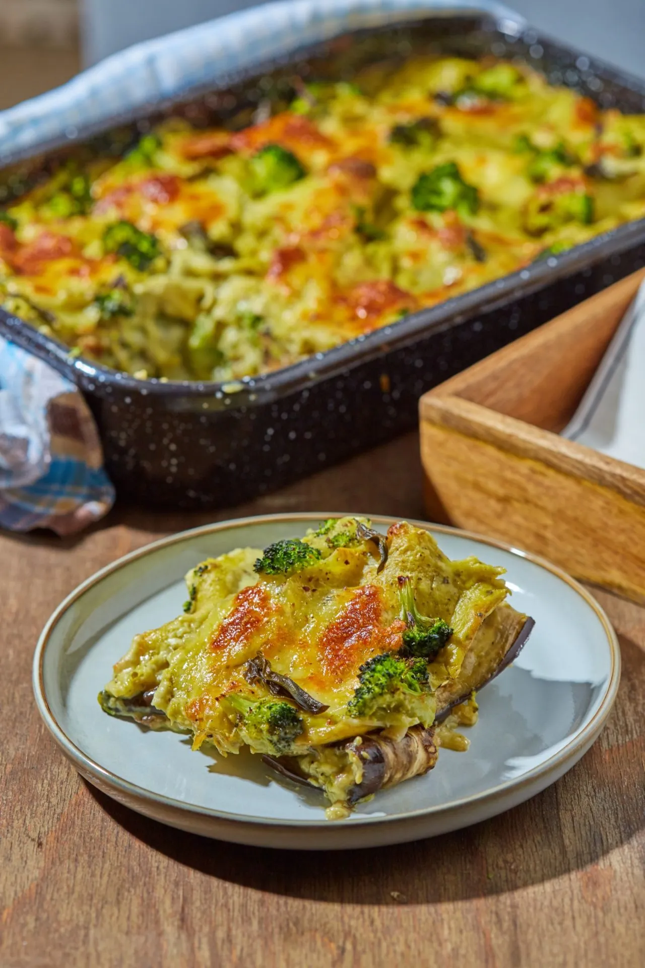 A mártáshoz a vajat felmelegítjük, beleszórjuk a lisztet, elkeverjük, majd fokozatosan felöntjük a tejjel, közben csomómentesre keverjük a besamelt. Mehet bele só, bors, szerecsendió, és ha már besűrűsödött, akkor a pesztó is. A mártásból egy keveset elkenünk egy sütőtál alján, majd rétegezzük bele a nyers tésztát, a zöldségeket, a sajtot és a besamelt, addig, amíg minden elfogy. A tetejére kerüljön még egy réteg mártás és sajt is. Dobunk a tetejére pár bazsalikomlevelet, és mehet is a 180 fokra előmelegített sütőbe kb. 30 percre, amíg aranyszínűre sül a sajt.