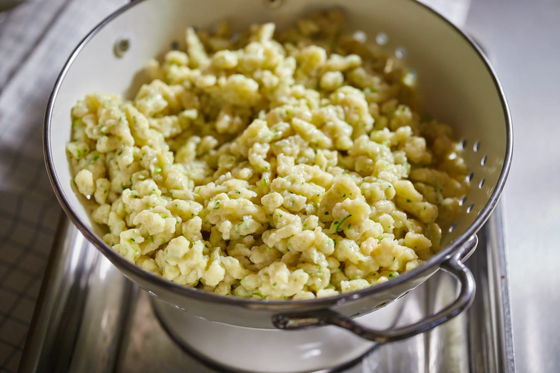 Egy nokedliszaggató segítségével a tésztát a forrásban lévő vízbe szaggatjuk. 2 perc főzés után leszűrjük és tetszőleges étel mellé köretként kínáljuk.