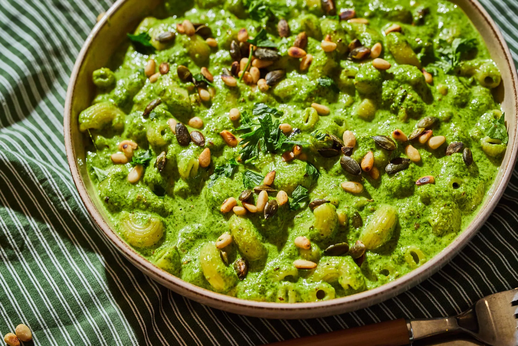 A tökmagot és a fenyőmagot egy száraz serpenyőben lepirítjuk, és a sajttal összeolvasztott tészta tetejére szórjuk. Frissen fogyasztva a legjobb, de felmelegítve is ugyanazt az élményt nyújtja: krémes, nagyon sajtos és ízekben gazdag.
