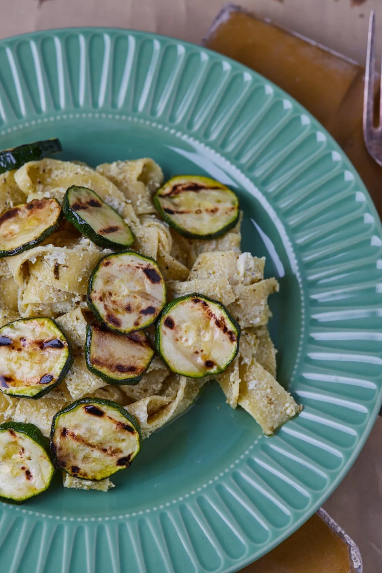A tésztát al dentére főzzük, leszűrjük, és összekeverjük 2 evőkanál olívaolajjal. A cukkinit 2-3 mm vastagra vágjuk, és egy enyhén kiolajozott grillserpenyőben, több részletben megpirítjuk. A ricottát és a pesztót összekeverjük egy tálban 2 evőkanál olívaolajjal, sózzuk, borsozzuk, beleforgatjuk a tésztát, és a sült cukkinivel tálaljuk.