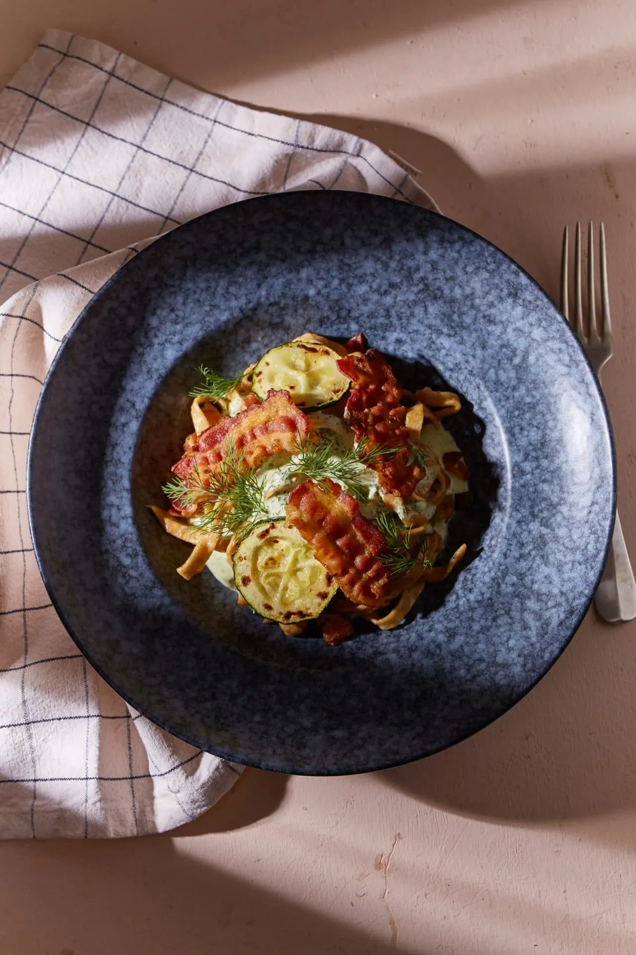 A bacon másik felét felkockázzuk, egy serpenyőben közepes lángon ropogósra pirítjuk, majd félretesszük. A visszamaradt zsírban megpirítjuk a felkockázott cukkinit. Hozzákeverjük a pirított kockázott bacont és a cukkinit, meglocsoljuk a joghurttal, és a pirított baconszeletekkel tálaljuk.