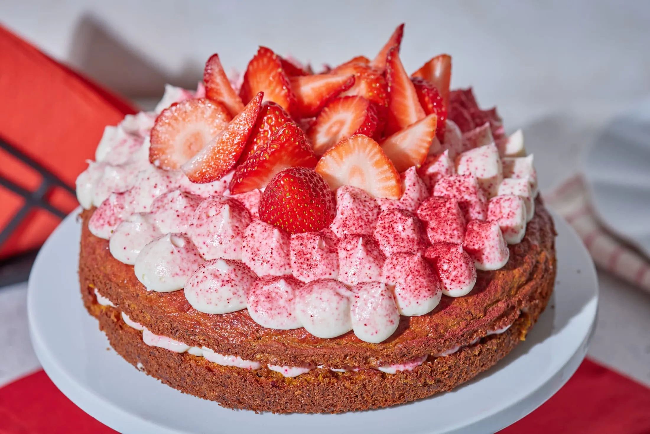 A tortát szoba-hőmérsékletűre hűtjük, majd vízszintesen félbevágjuk. A krém felét a torta közepébe nyomjuk, meghintjük kevés céklaporral, majd ráhelyezzük a tetejét és a maradék krémet tetszés szerint eloszlatjuk rajta. Végül rászitálunk egy kevés céklaport, a szeletelt eperrel díszítjük, és némi hűtés után már ehetjük is.