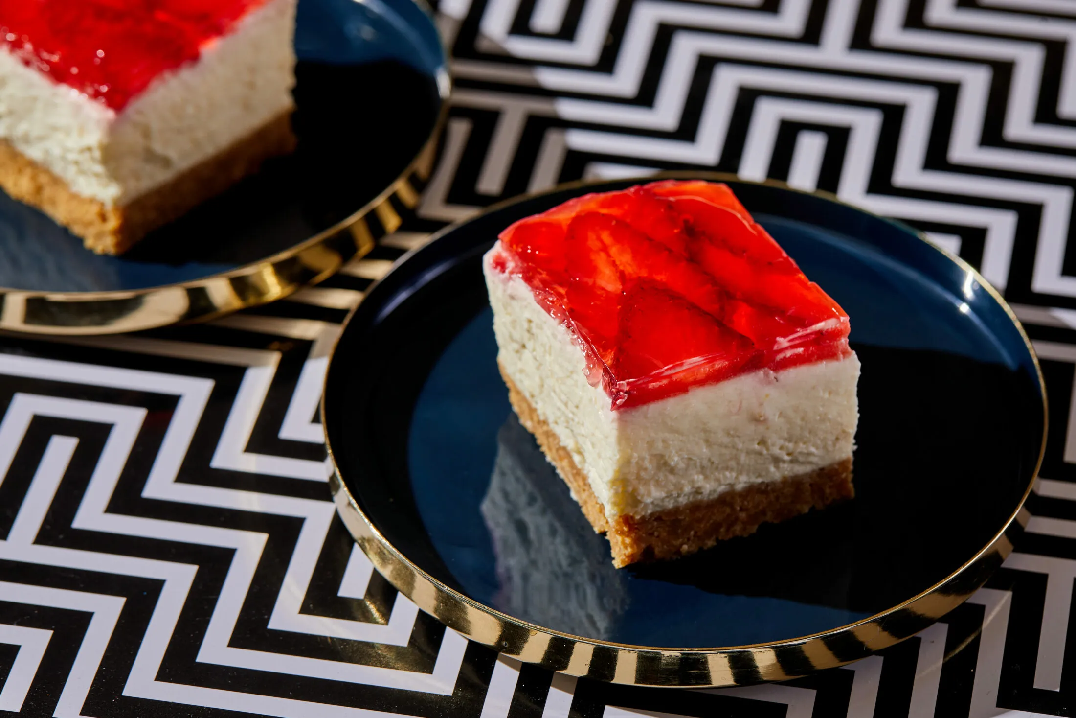 Az epres réteghez az epreket vékony szeletekre vágjuk, és a sajttortás réteg tetejére rakosgatjuk őket. A piros tortazselét elkeverjük a vízzel és az eritrittel, majd egyet forralunk rajta, kb. 10 percig hagyjuk hűlni, aztán az eperszeletekre csorgatjuk. Bedobjuk a fagyasztóba pár órára, vagy a hűtőbe egy éjszakára.