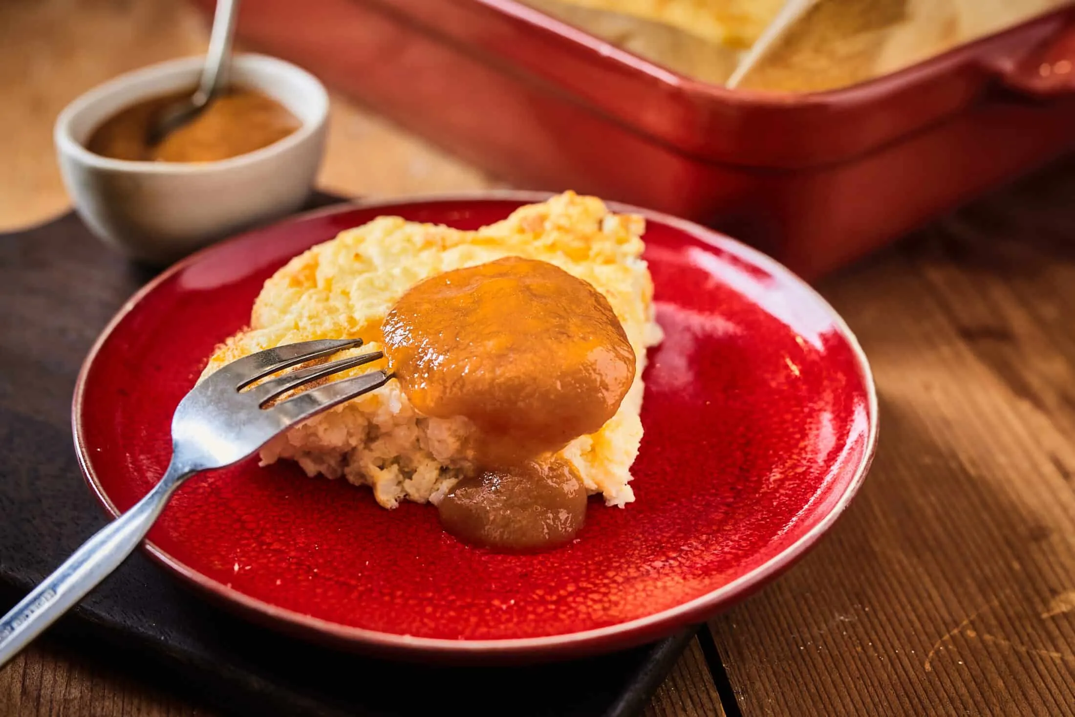 Ha elkészült a tejberizs, 2-3 részletben belekeverjük a sárgáját, és hagyjuk kihűlni. Ezután egy spatulával beleforgatjuk a fehérjét. Sütőpapírral bélelt tepsibe öntjük a masszát, és 180 fokra előmelegített sütőben 45 perc alatt megsütjük. Lekvárral tálaljuk.