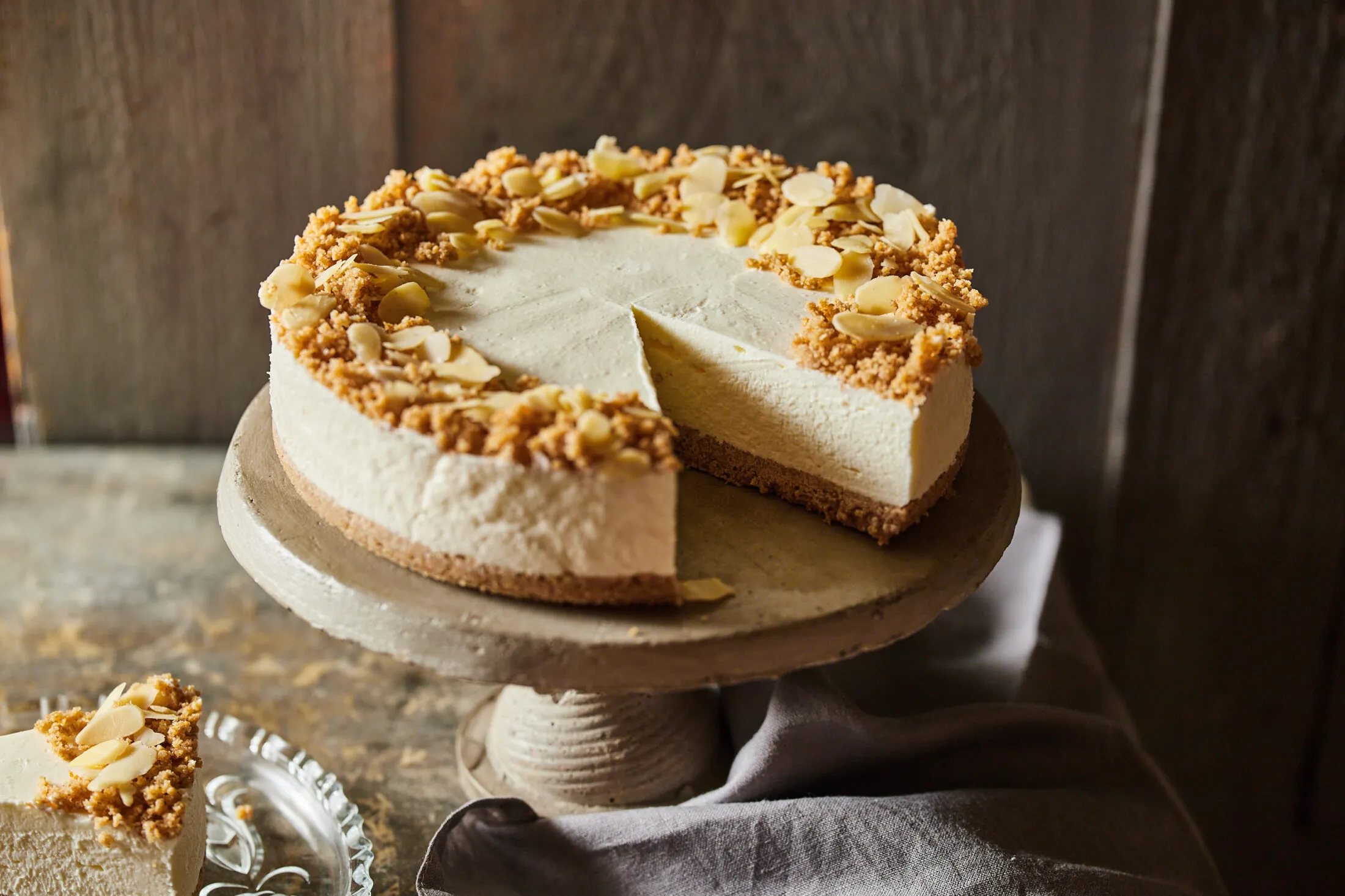 Ezután a sajtkrémes réteget a kekszalapra simítjuk, és hagyjuk, hogy megszilárduljon a fagyasztóban kb. 2 óra alatt, vagy egy éjszakára a hűtőbe rakjuk. Másnap egy műanyag késsel körbevágjuk a tortát a forma mentén, lekapcsoljuk róla a tortakarikát, és mandulaforgáccsal, valamint a félretett vajas kekszmorzsával díszítjük.