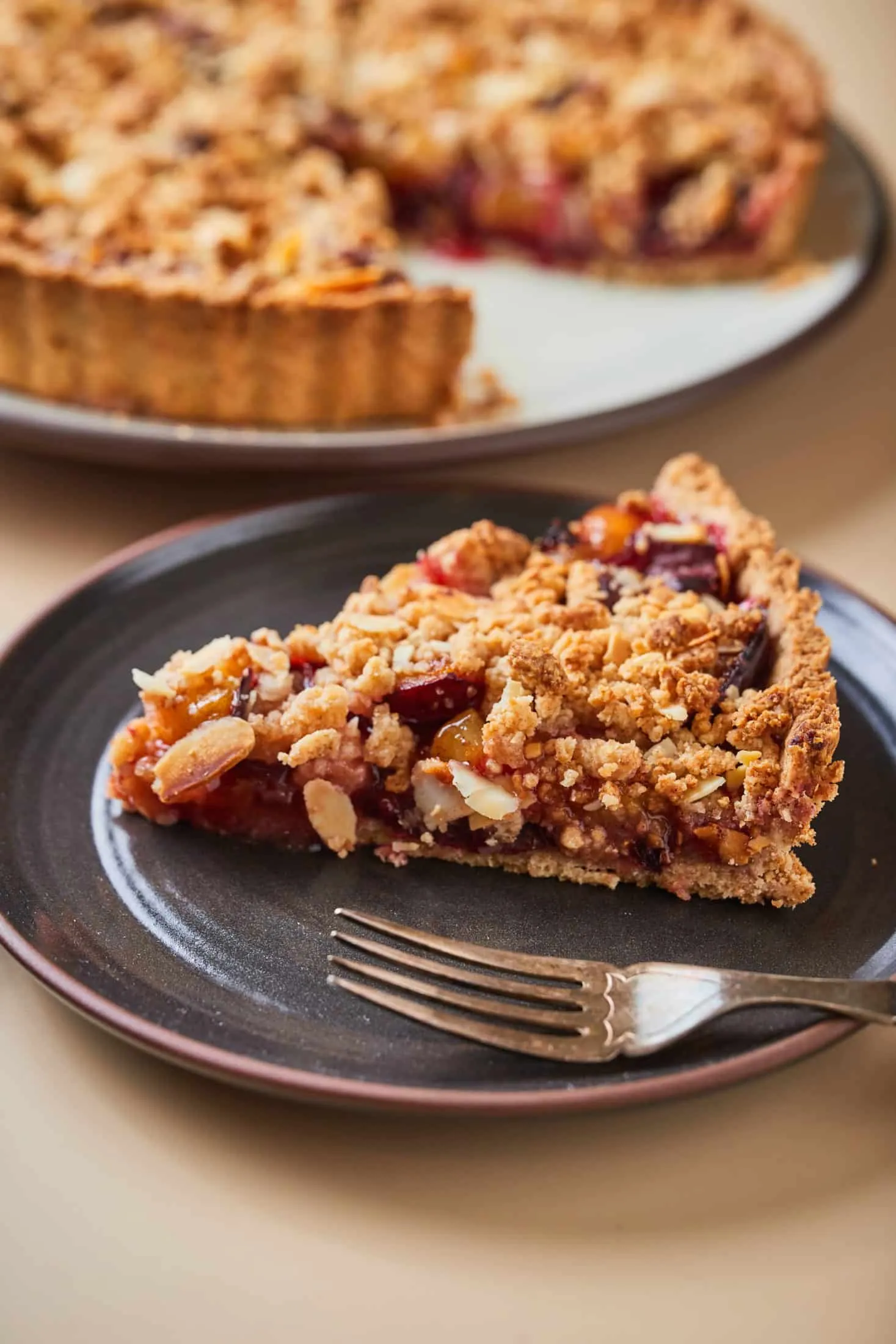 A tészta nagyobbik részét kivesszük, akkorára nyújtjuk, hogy kicsit túllógjon a formán, levágjuk a széleit, megszurkáljuk egy villával, és 180 fokra előmelegített sütőben 10 perc alatt elősütjük. Kivesszük, belekanalazzuk a szilvás keveréket, ráreszeljük nagy lyukú reszelőn a kisebbik tésztát, majd megszórjuk a mandulával, és mehet vissza a sütőbe 30 percre. Ha megsült, legalább 10 percet hagyjuk állni, majd szeleteljük.