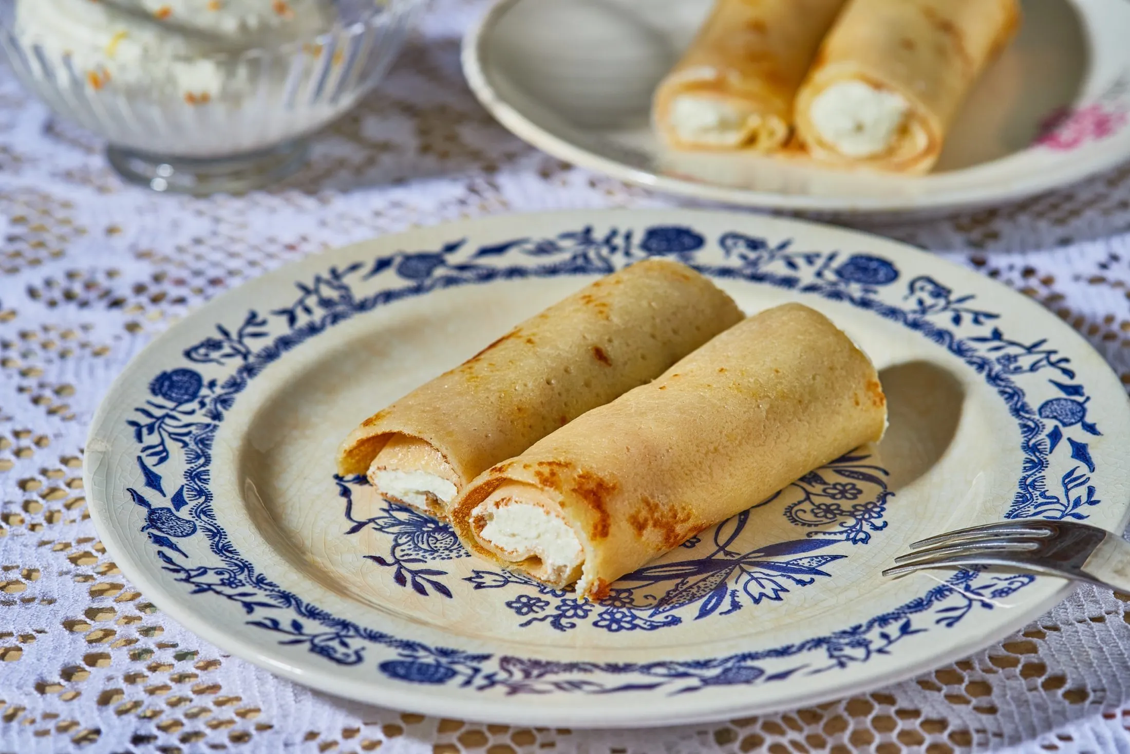 Egy palacsintasütőben, közepes lángon megsütjük a palacsintákat, merőkanálnyi adagokban, oldalanként 1-3 perc alatt. A palacsintákat hagyjuk minimum szoba-hőmérsékletűre hűlni, azután a habzsákkal nyomunk bele a töltelékből, és feltekerjük. A két végét levágjuk le, és persze ezt nyilván ne dobjuk ki, hanem egyből pusziljuk be.
