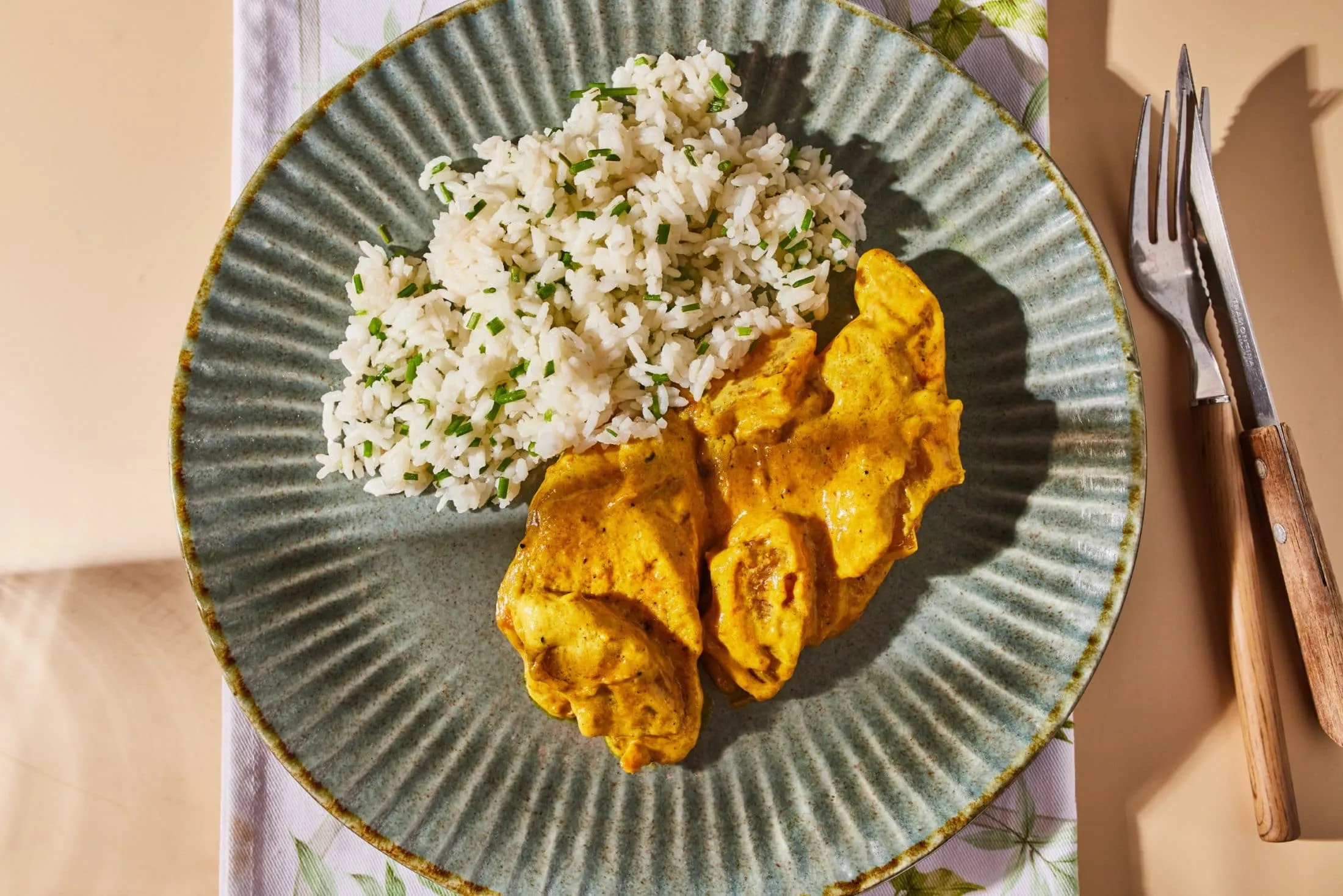 Az currys csirke elkészítéséhez a csirkemellet 1,5 cm vastag szeletekre vágjuk, és sózzuk, borsozzuk. Egy serpenyőben, oldalanként 3-4 perc alatt, magas hőmérsékleten aranybarnára pirítjuk az olajon a külsejét, majd kiszedjük és félretesszük.