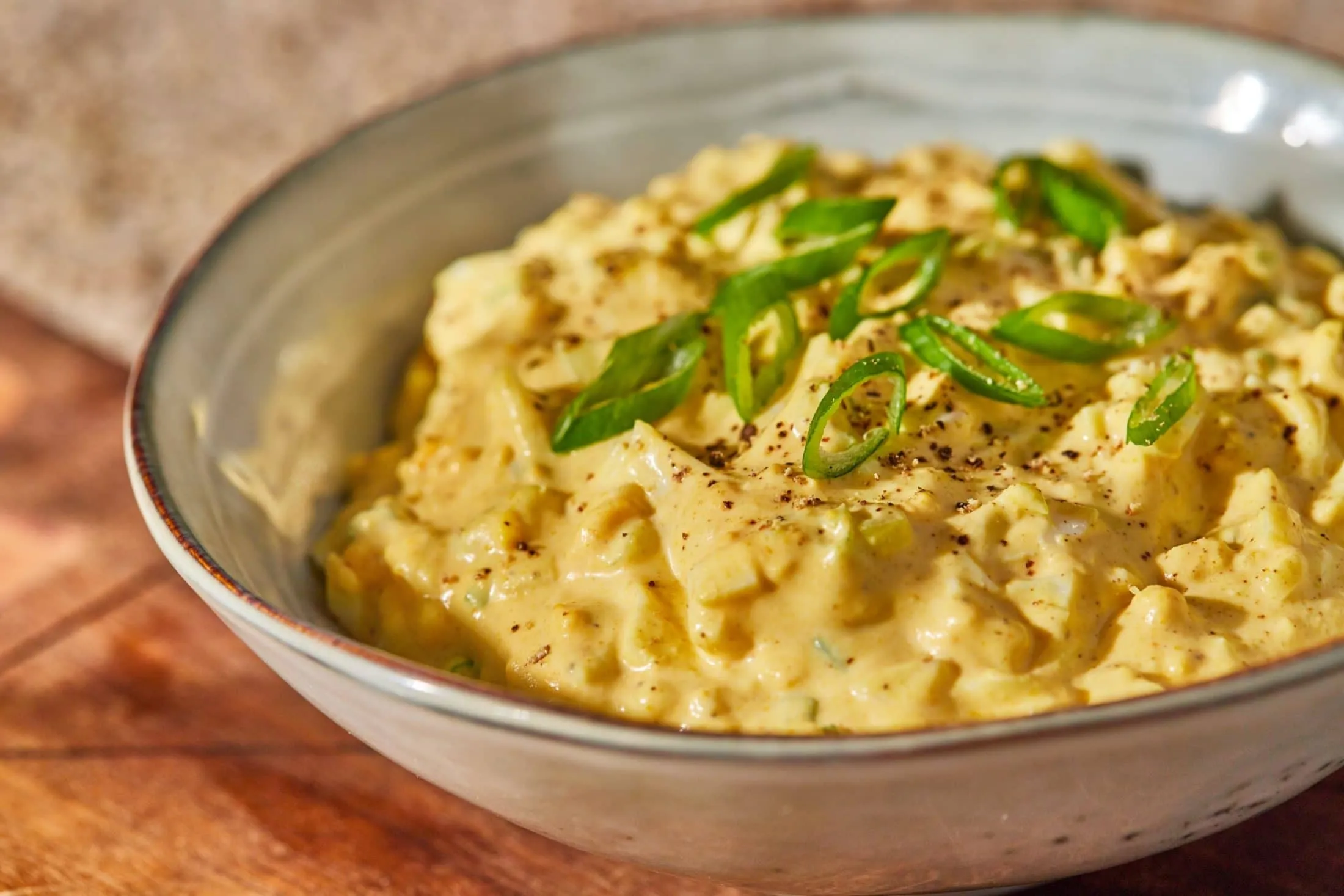 A sárgájukat egy villával összetörjük, a fehérjéket pedig egy éles késsel apróra vágjuk. Hozzákeverjük a sót, a borsot, a curryport és a vajat. Ezután átkeverjük az egészet, majd mehet bele a majonéz, a tejföl és az apróra vágott újhagyma is.