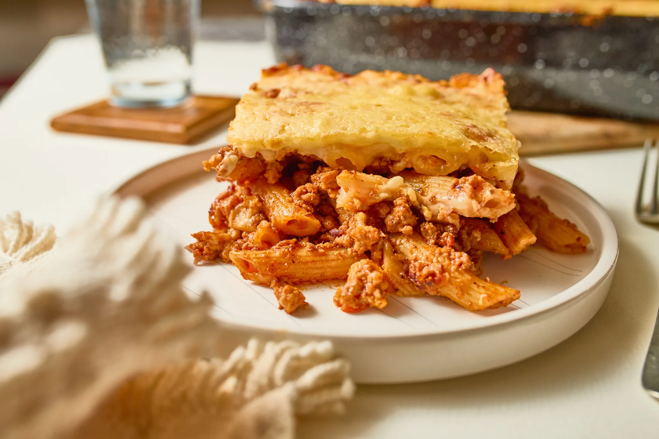 A darált húsos rakott tészta első lépéseként zsírt olvasztunk egy serpenyőben, majd közepes hőfokon, kb. 7 perc alatt megdinszteljük benne a finomra vágott vöröshagymát és a fokhagymát. Hozzáadjuk a darált húst, és magas hőfokon 2 perc alatt lepirítjuk. Sózzuk, borsozzuk, ízesítjük a fűszerpaprikával, a köménnyel, a daráltpaprika-krémmel, felöntjük a passatával, a vízzel, majd visszavesszük a hőfokot közepesre, és 15-20 perc alatt készre főzzük.