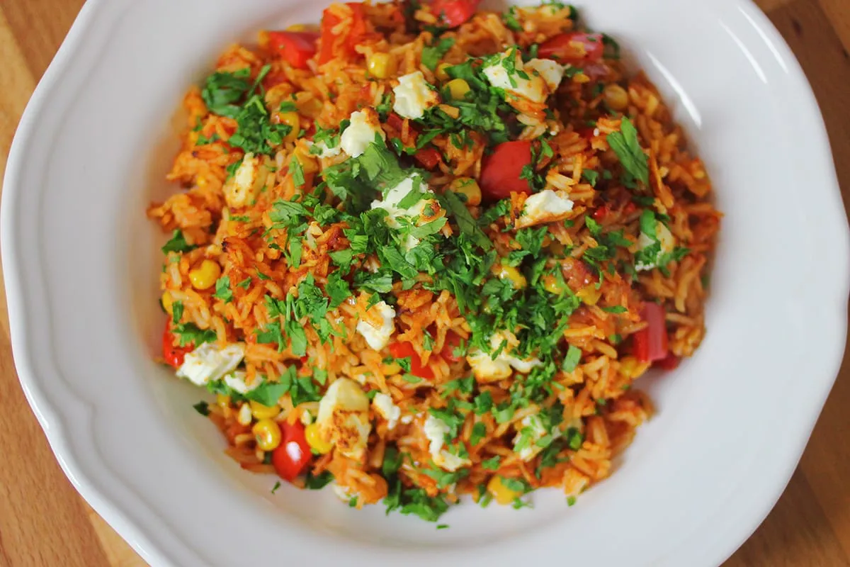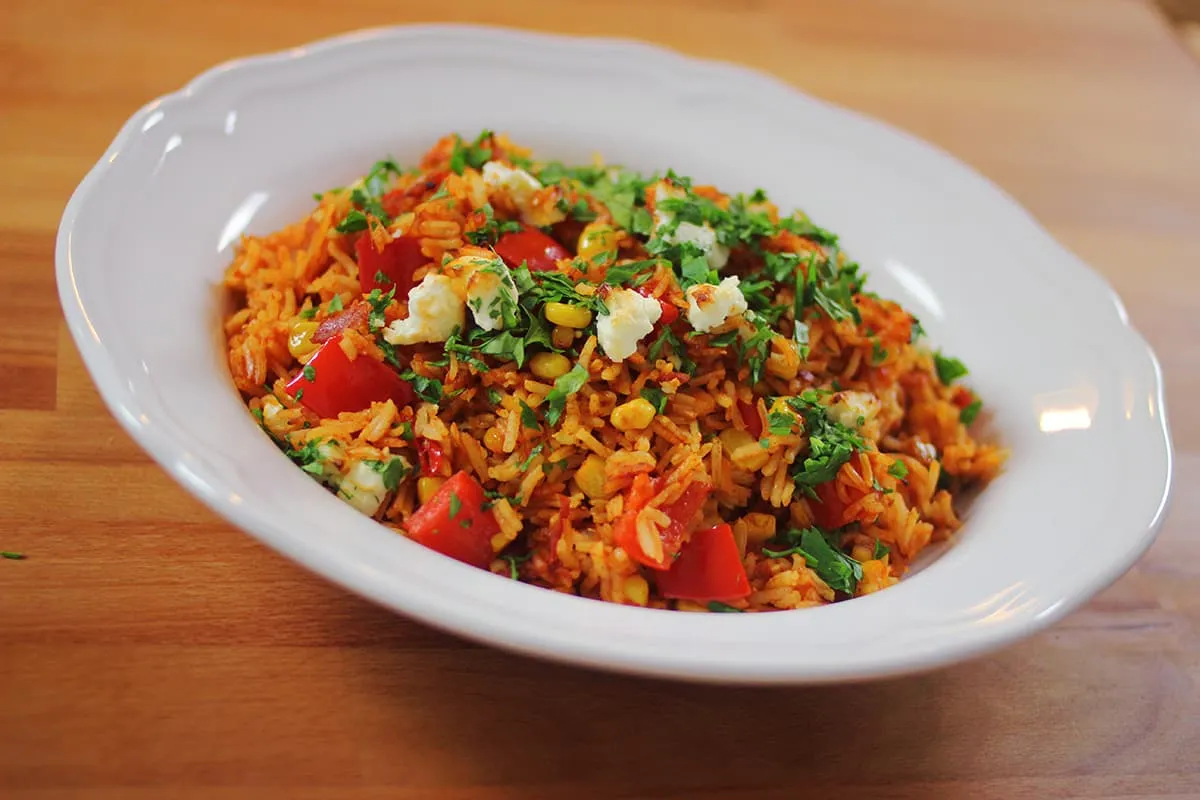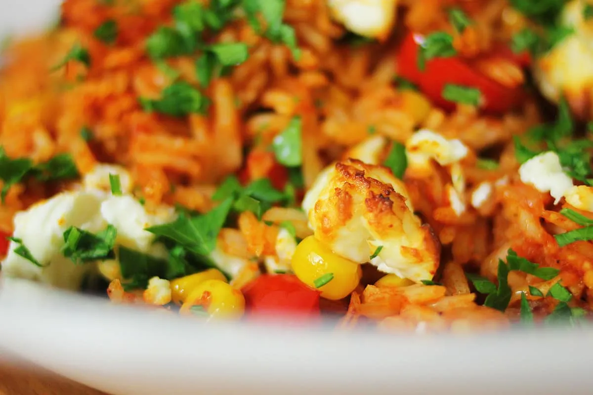 Beletesszük és fűszereket és a paradicsomkonzervet, összefőzzük. Ha besűrűsödött, mehet bele a kukorica és a főtt rizs. Jól összekforgatjuk és a tetejére morzsoljuk a sajtot. 200 fokra előmelegytett sütőben 15 percig sütjük, amíg a sajt megpirul. Tálalás előtt megszórjuk aprított korianderrel és petrezselyemmel.