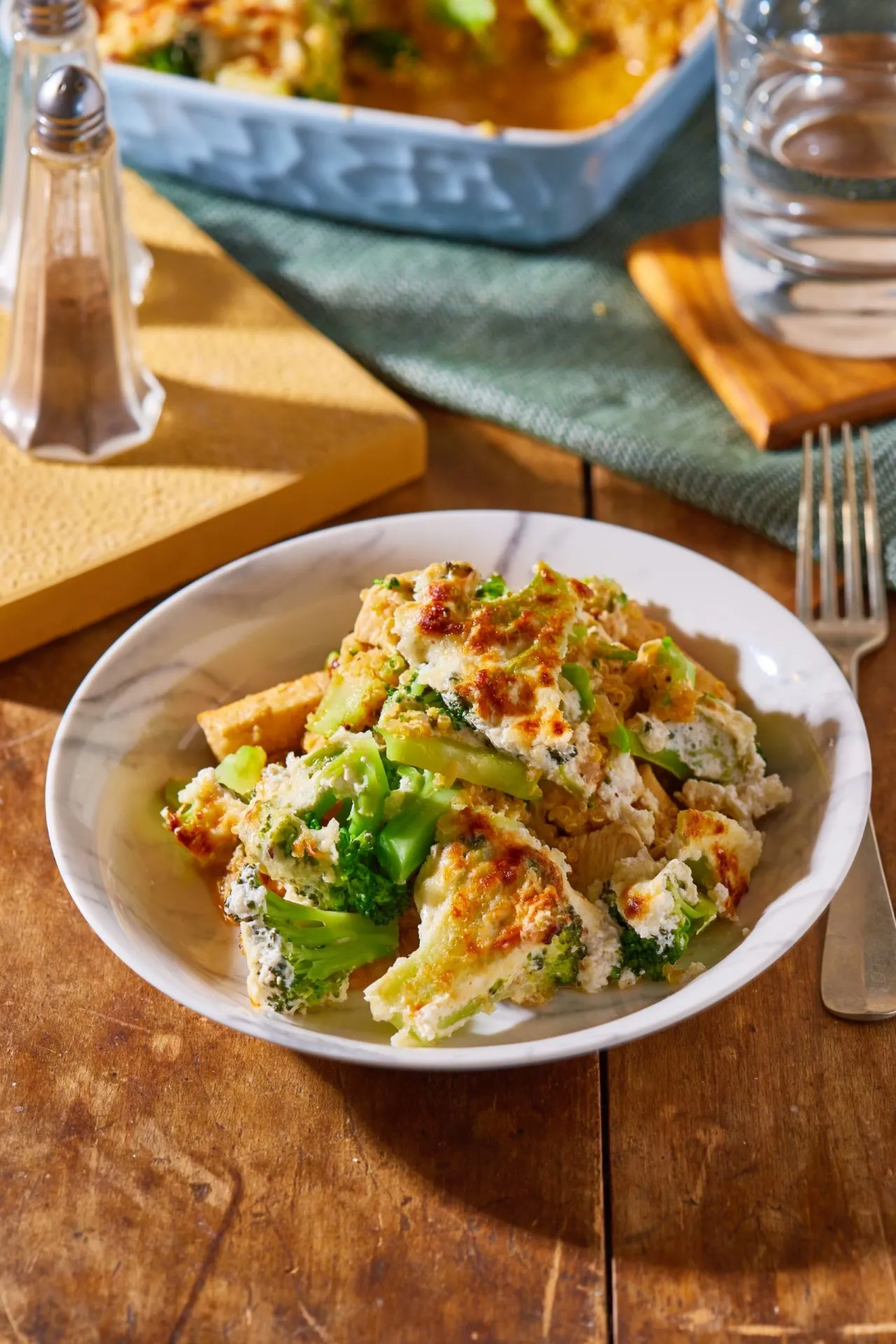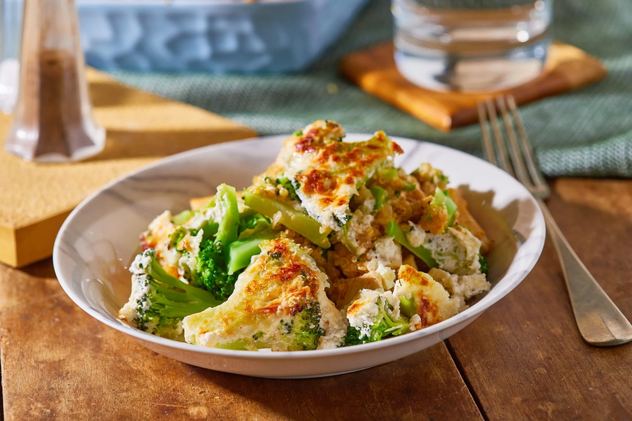 Egy nagyobb serpenyőben az olajon, magas hőmérsékleten, hirtelen megpirítjuk a kockákra vágott csirkemellet, sózzuk, borsozzuk, kiszedjük, és a visszamaradt zsiradékon üvegesre pároljuk az apróra vágott hagymákat. Sózzuk, borsozzuk, megszórjuk a fűszerekkel, visszarakjuk a csirkét, felöntjük az alaplével, és a negyedére forraljuk. Hozzáadjuk a quinoát, majd ezt a keveréket egy közepes tepsi aljára rakjuk, és rászórjuk a brokkolit. A tejfölt kikeverjük a reszelt parmezánnal és a fűszerekkel, majd lekenjük vele a brokkolit, és 200 fokra előmelegített grillsütőben addig sütjük, amíg meg nem pirul a teteje.