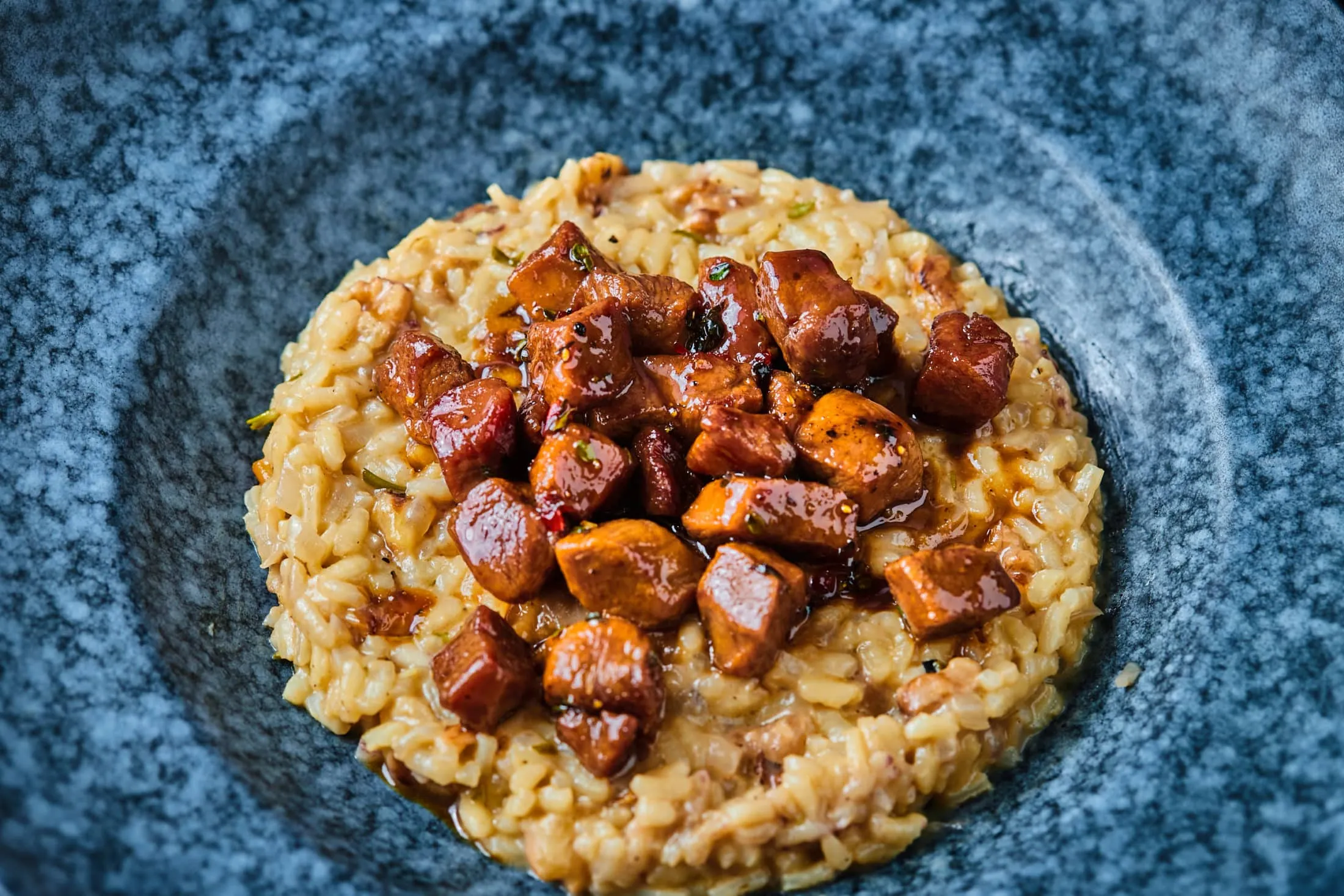 A rizottót tányérba szedjük, a tetejére pakoljuk a kacsamellkockákat és csorgatunk rá a vajas mártásból.