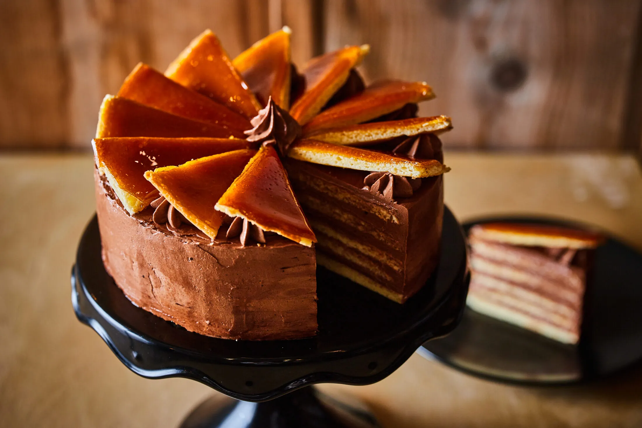 A 6. lapból készítjük el a tetőt. Egy serpenyőben, közepes lángon megkaramellizáljuk a porcukrot, majd gyors mozdulatokkal áthúzzuk vele a piskótalap tetejét. A még forró karamelles lapon egy kés felső részével bejelöljük a tortacikkeket úgy, hogy minden egyes mozdulat előtt megvajazzuk a kés tompa oldalát, majd az élével felvágjuk a 12 szeletet. A pihentetés után kivesszük a hűtőből a tortát, nyomunk rá csillagcsöves habzsákból 12 habrózsát, és a megdermedt karamelles tetővel díszítjük a torta tetejét.