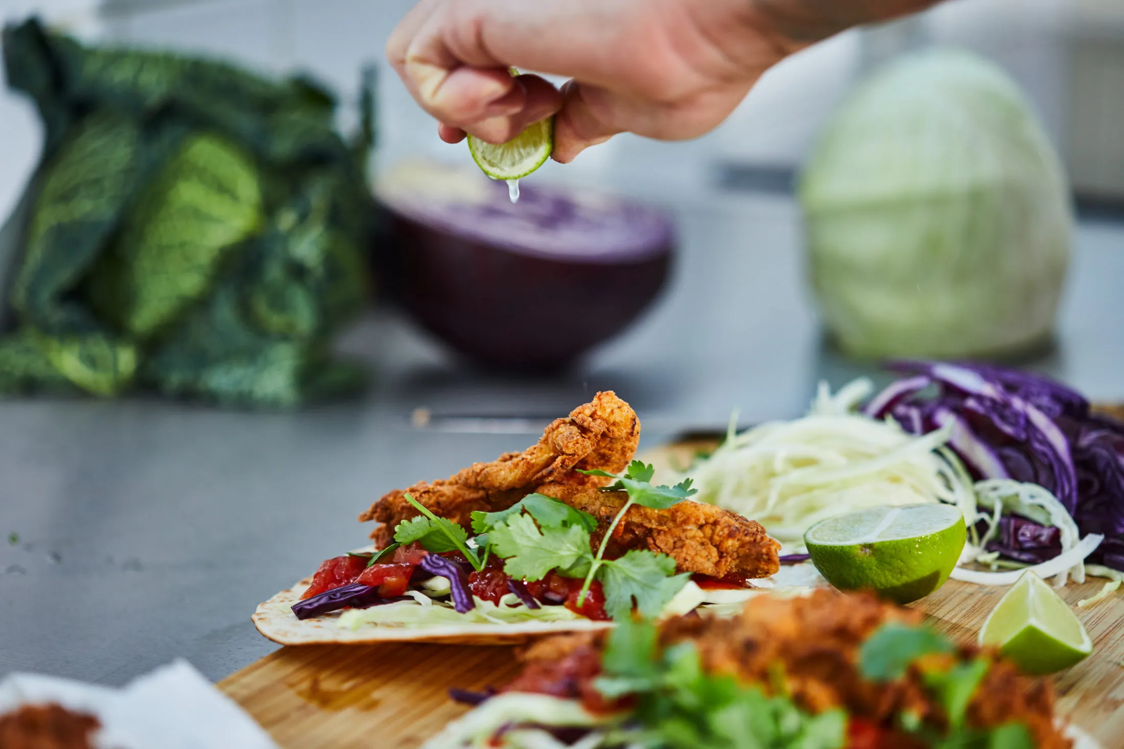 A tortillalapba teszünk a káposztákból, a salsa szószból, 2-3 sült csirkemellet tépkedünk rá, megszórjuk korianderrel, facsarunk rá lime-ot, és fogyasztjuk.