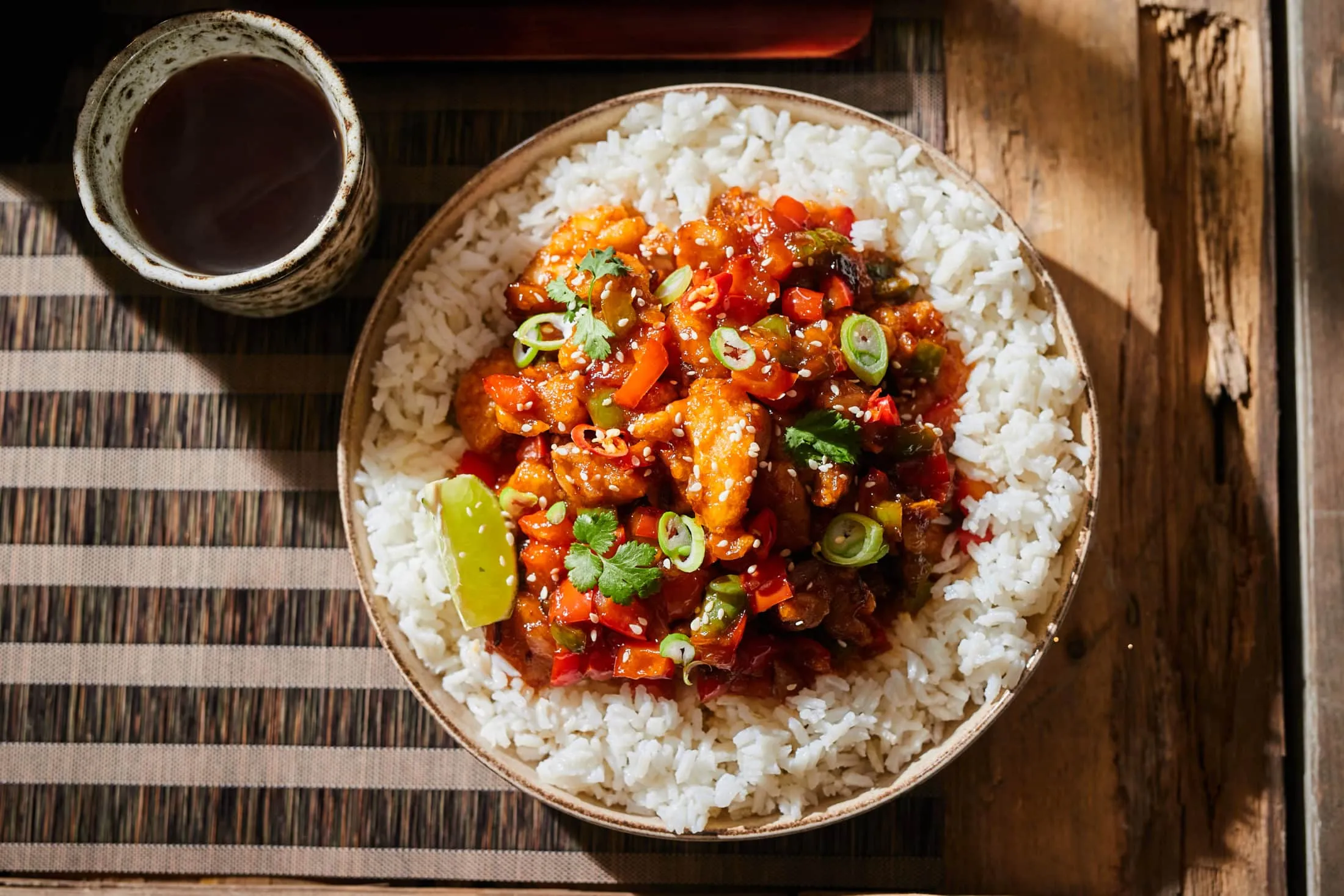 A szósz maradék hozzávalóit először csomómentesre keverjük egy tálban, majd beleöntjük a serpenyőbe, legvégül pedig beleforgatjuk a már megsült csirkéket is. Rizzsel, karikákra vágott újhagymával, kevés szezámmaggal és egy-egy lime-gerezddel tálaljuk.