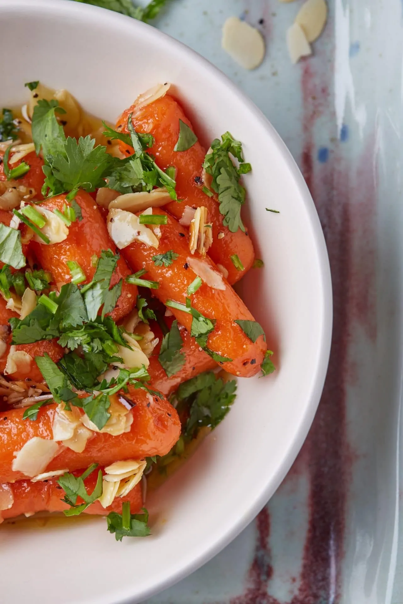 A répát megpucoljuk és kis darabokra vágjuk, majd bő, sós vízben 5 percig főzzük, leszűrjük. Ezután egy serpenyőben az olajon jól megpirítjuk. Sózzuk, borsozzuk, megszórjuk a mandulával, és ha színt kapott, ráöntjük a mézet, az ecetet, és kicsit beforraljuk. Friss korianderrel tálaljuk.