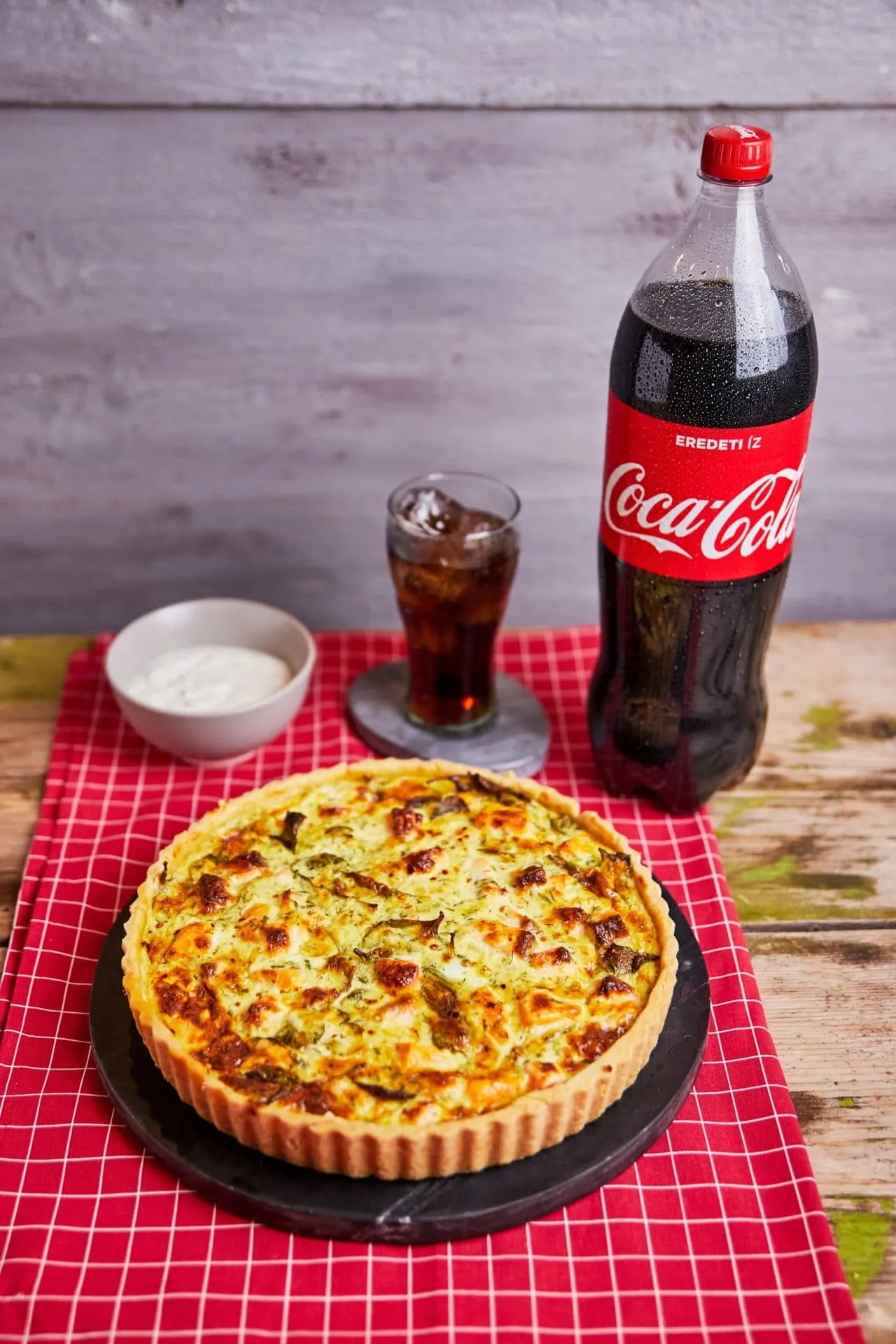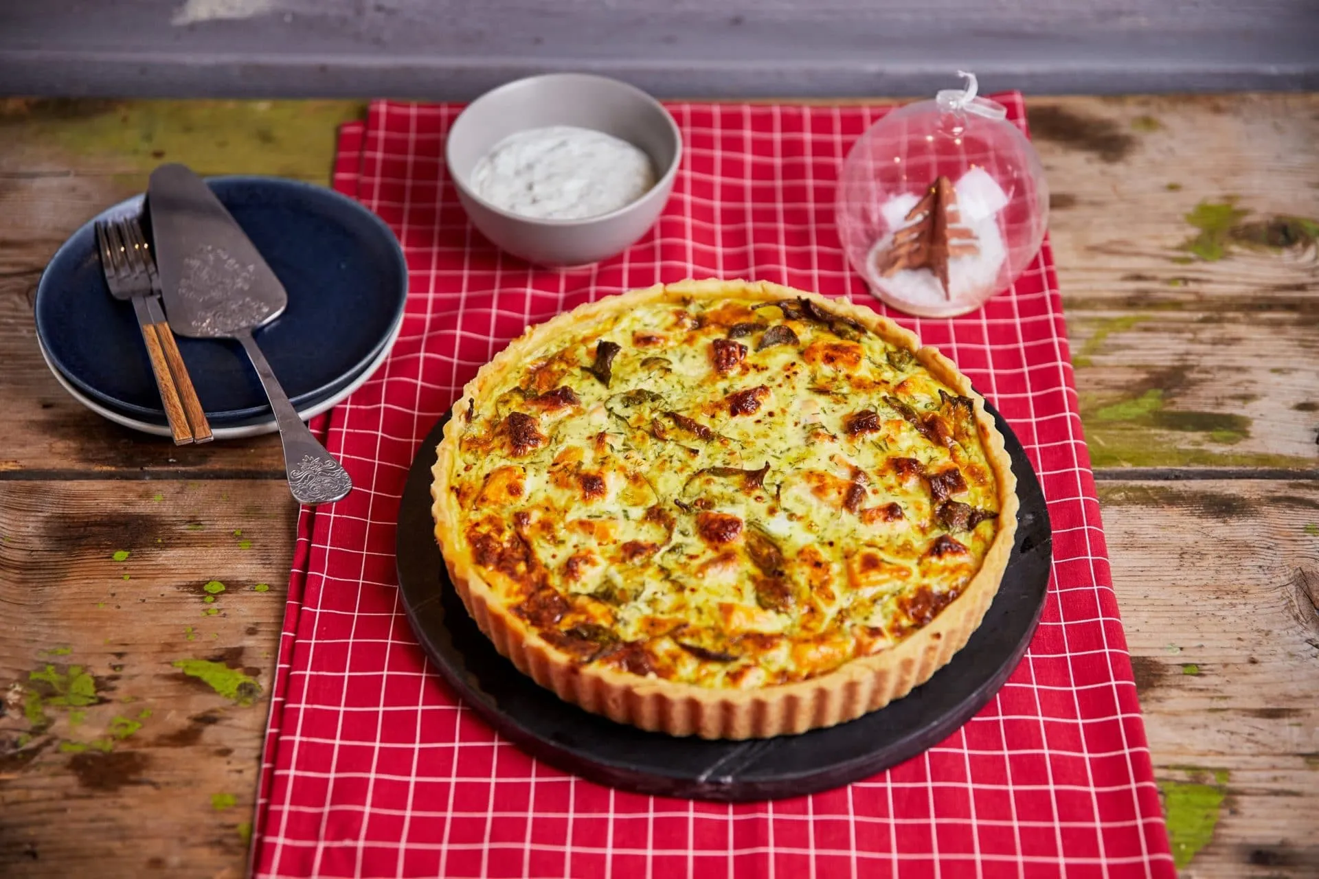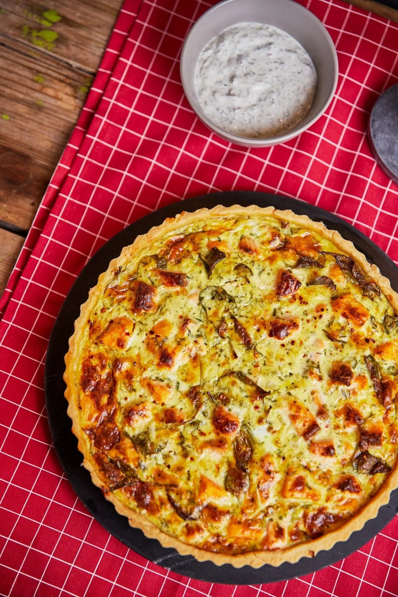 Kivesszük a tésztát a hűtőből, és lisztezett felületen kb. 26-27 cm átmérőjű körré nyújtjuk, majd belerakjuk a formába. Belesimítjuk, rányomkodjuk a tésztát az oldalára is, a felesleget egy éles késsel levágjuk, rakunk rá 2 réteg alufóliát, feltöltjük száraz sütőbabbal, és 180 fokra előmelegített sütőbe toljuk 10 percre. A sütés után a fóliával együtt levesszük róla a sütőbabot, beletöltjük a tölteléket, és 35 perc alatt készre sütjük.