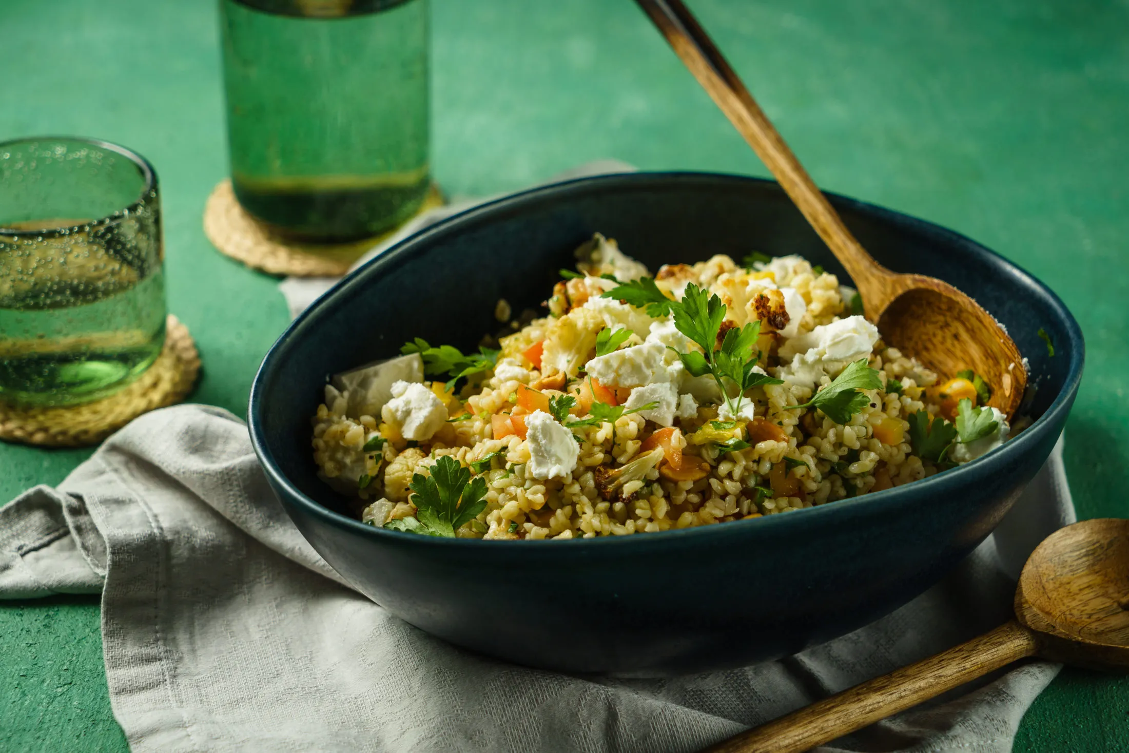 A karfiolos bulgursaláta elkészítéséhez a karfiolt 1-2 cm-es rózsákra szedjük, sózzuk, borsozzuk, azután egy sütőpapírral bélelt tepsire helyezzük, és a tetejére rakjuk a kockázott vajat, majd 200 fokra előmelegített sütőben 20 perc alatt készre sütjük.