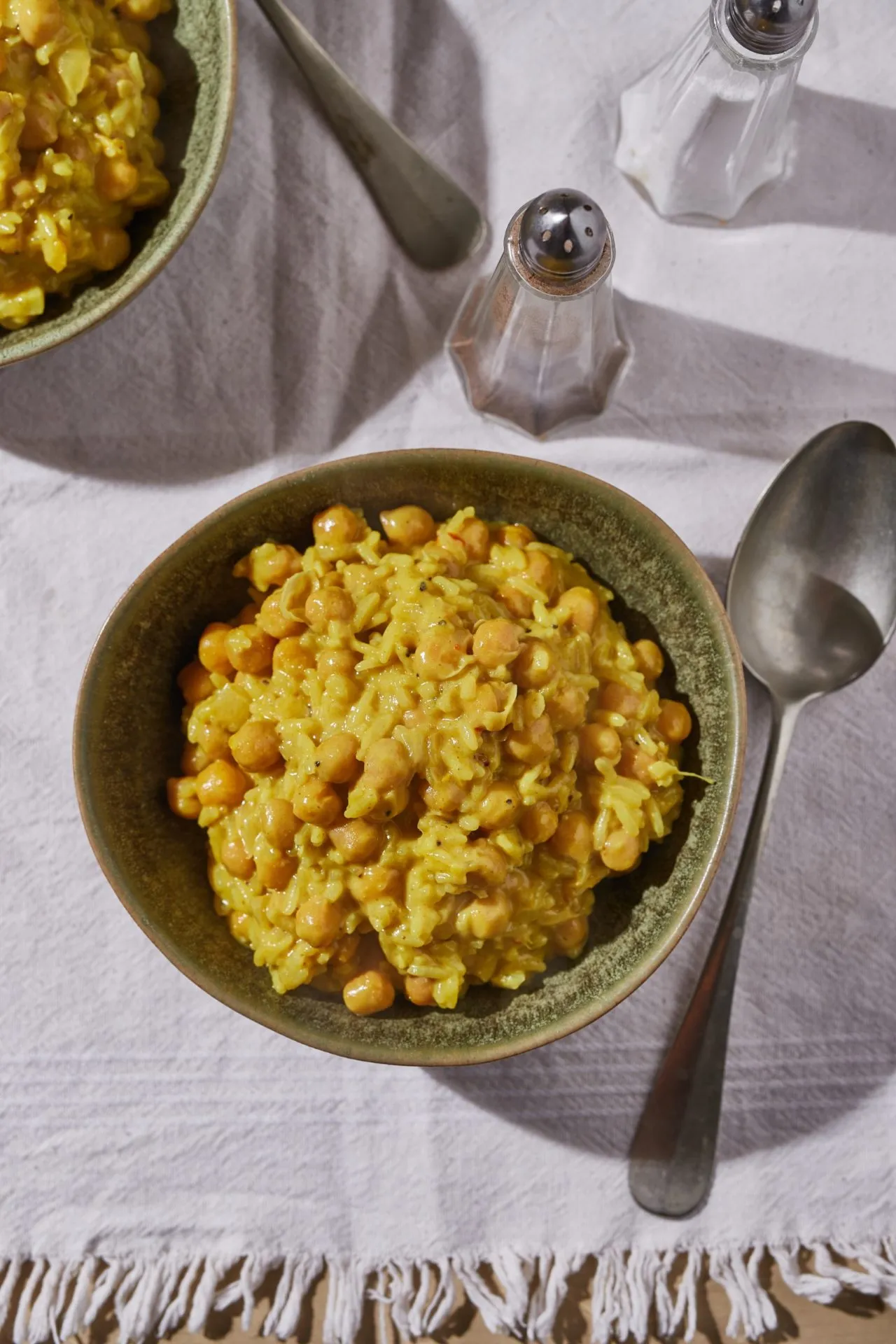 Az olajon alaposan lepirítjuk az apróra vágott hagymákat és gyömbért. Megszórjuk a curryporral, elkeverjük benne a rizst, a lecsepegtetett csicseriborsót, sózzuk, borsozzuk, hozzáadjuk a chilipelyhet, majd felöntjük a kókusztejszínnel és a vízzel. Fedő alatt addig főzzük, amíg a rizs meg nem puhul. Végül ráreszeljük a lime héját és meglocsoljuk a levével, majd megszórjuk valamilyen apróra vágott zöldfűszerrel.