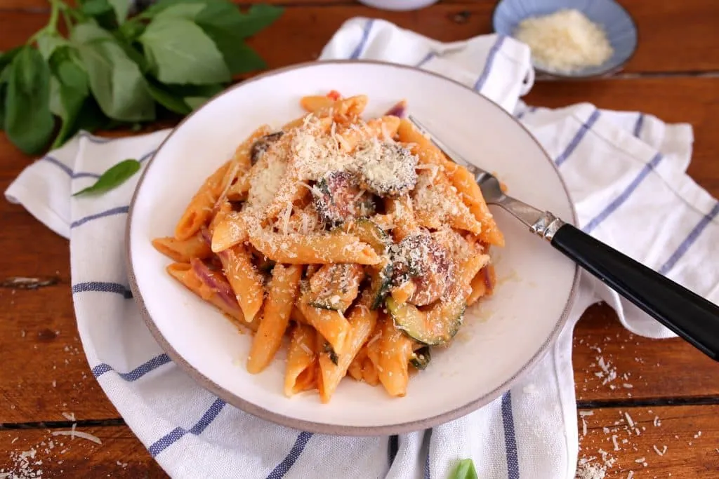 Munkából hazaesve nem nagyon vágyik az ember másra, mint egy kiadós pihenésre. Vacsorázni viszont kell és az mindig előnyt jelent, ha gyorsan elkészül az a valami. Hát ez az egylábasos pasta egy jó megoldás lehet, hisz nincs más dolgunk vele, mint ezt a pár hozzávalót felszeletelni, mindet egy lábasba tenni és várni 15 percet, hogy elkészüljön. Lusta vacsikra fel!