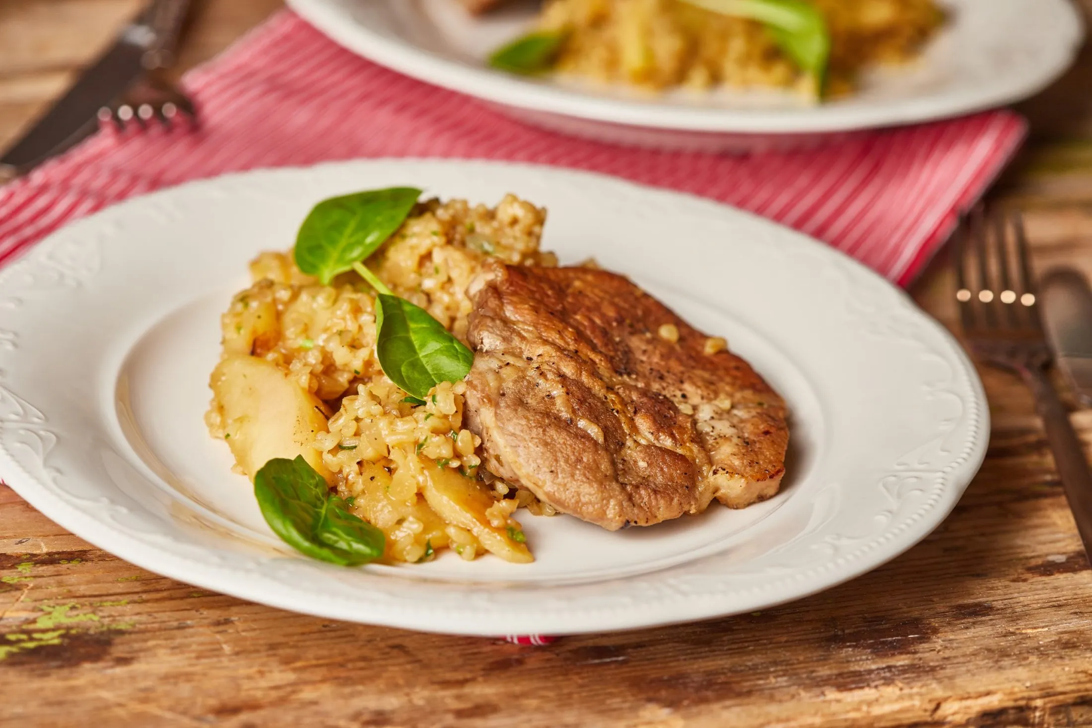 Az egyserpenyős almás tarja elkészítéséhez először egy serpenyőt közepesen erős lángon felhevítünk. A tarjaszeleteket sózzuk, borsozzuk, majd 1-2 evőkanál olajon mindkét oldalukat kérgesítjük, aztán egy deszkára szedjük és félretesszük.