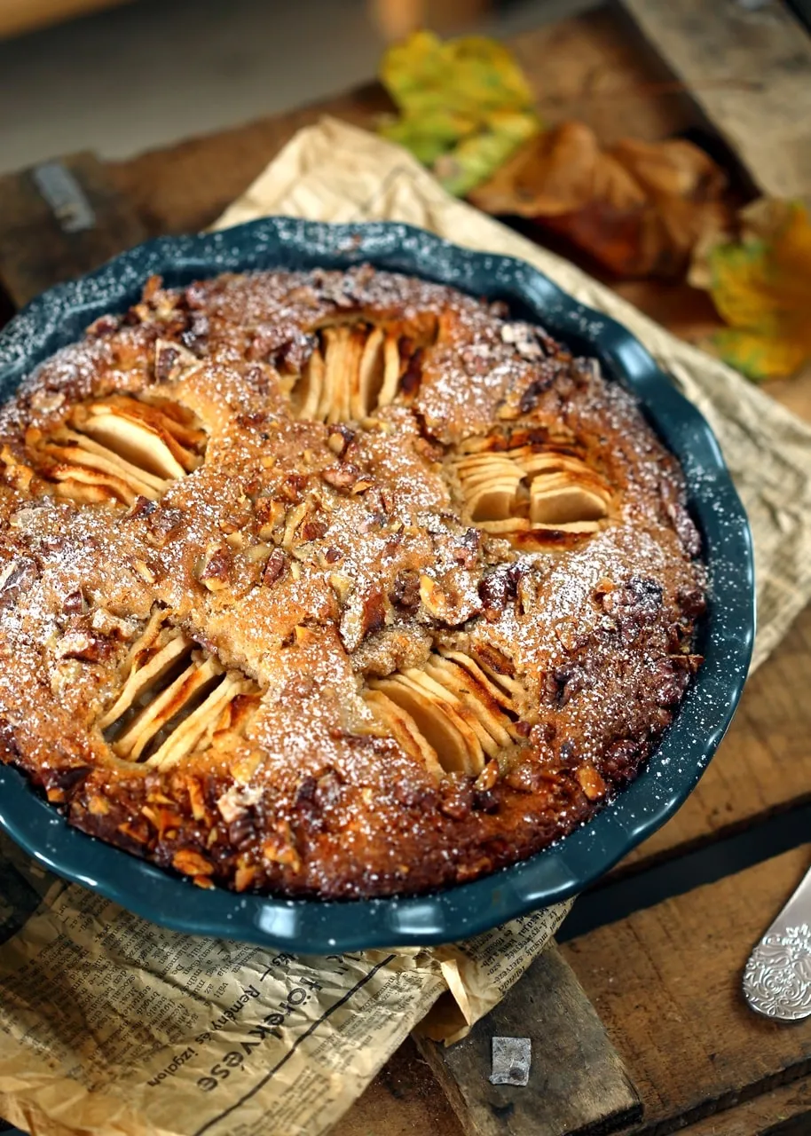 Az egyszerű almás-diós süti elkészítéséhez a lisztet, a sütőport és a fűszereket összekeverjük egy tálban. Egy másik tálban habosra verjük a vajat a cukorral, majd hozzáadjuk a tojásokat, joghurtot és a vaníliás cukrot. 2 almát meghámozunk és kisebb kockákra vágunk, majd a vajas masszához keverjük a lisztes keverékkel együtt. Jól átforgatjuk a tésztát és piteformába simítjuk. A maradék 3 almát félbevágjuk, kiszedjük a magházát, vékony szeletekre vágjuk és a tésztába nyomkodjuk őket. A diót durvára vágjuk és a maradék barna cukorral együtt a süti tetejére szórjuk. 180 fokos sütőben kb. 45 percig sütjük. Tűpróbával ellenőrizzük, hogy átsült-e.