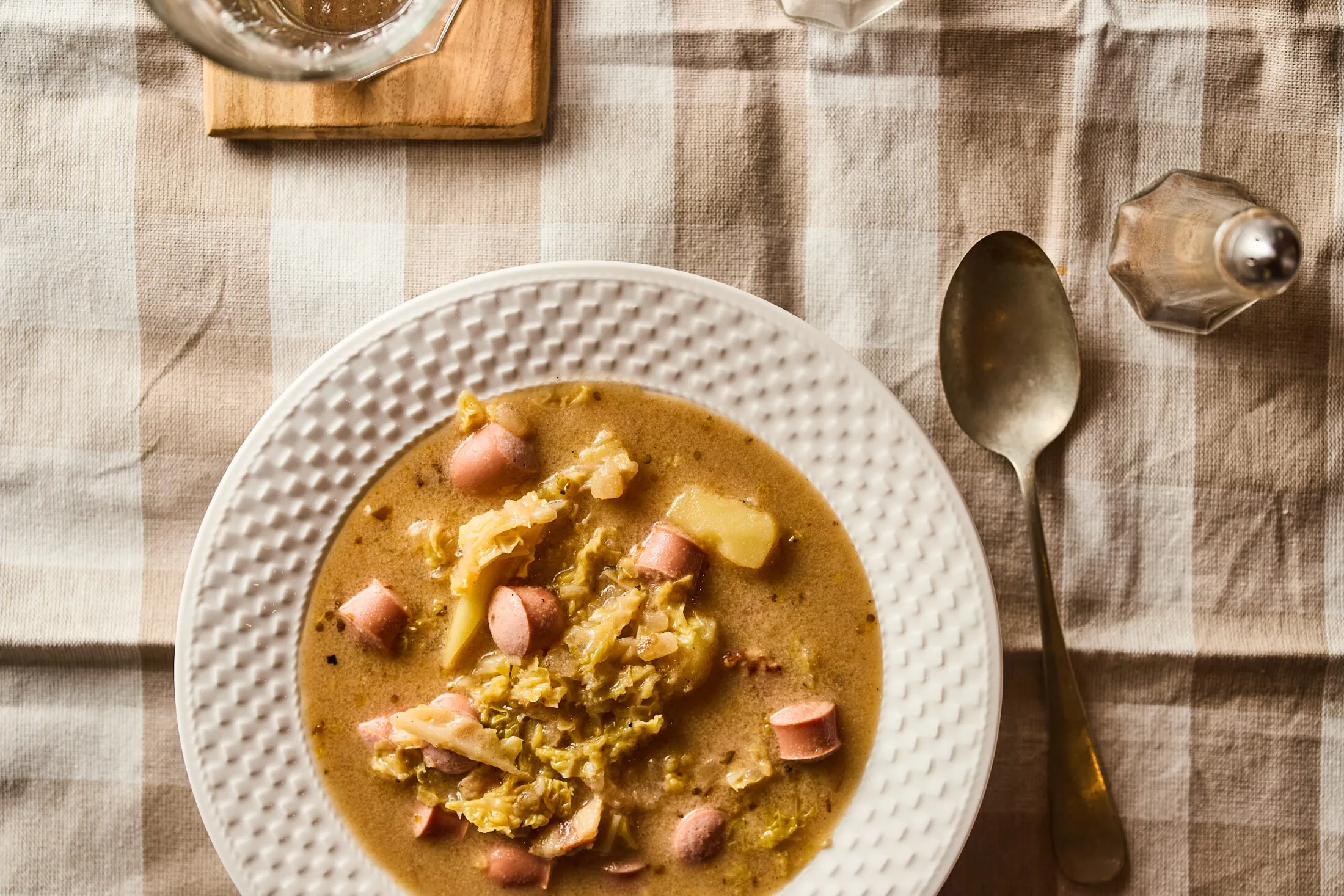 A megpucolt burgonyát felkockázzuk, majd a kelkáposztával együtt pirítjuk 5 percig. Hozzáadjuk a fűszerpaprikát, a köményt, majd felöntjük a vízzel. Addig főzzük, amíg a burgonya majdnem teljesen megfő. Ha elértük ezt a pillanatot, akkor a kikevert lisztes-tejfölös habarásba merünk kb. 100 ml-t a forró levesből hőkiegyenlítés gyanánt és elkeverjük. Hozzáadjuk a leveshez a habarást, a felkarikázott virslit, a majoránnát, illetve beállítjuk a savasságát a citromlével. Még 5 percig főzzük, és kész is vagyunk!