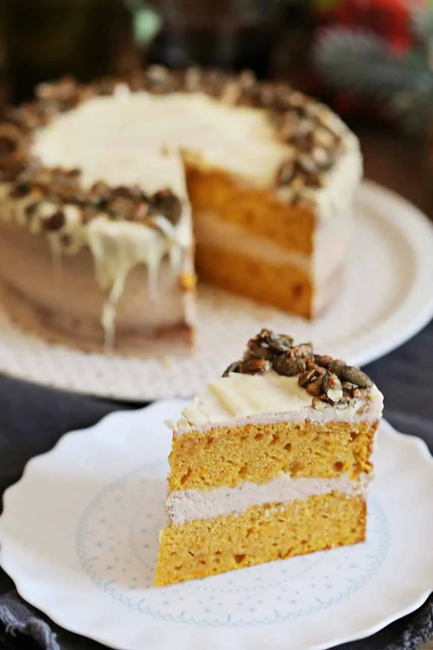 A tökmagot egy száraz serpenyőben lepirítjuk, majd hozzáadjuk a cukrot, fűszereket, megvárjuk míg kissé karamellizálódik a cukor és bevonja a tökmagokat (pár perc), majd sütőpapírra rakjuk. Az egyik kihűlt tortalapra kenjük a krém kicsit több mint felét, rárakjuk a másik lapot, körbekenjük a maradék krémmel. Vízgőz fölött felolvasztjuk a fehércsokit és a torta tetejére kenjük, majd körbeszórjuk a pirított tökmaggal.