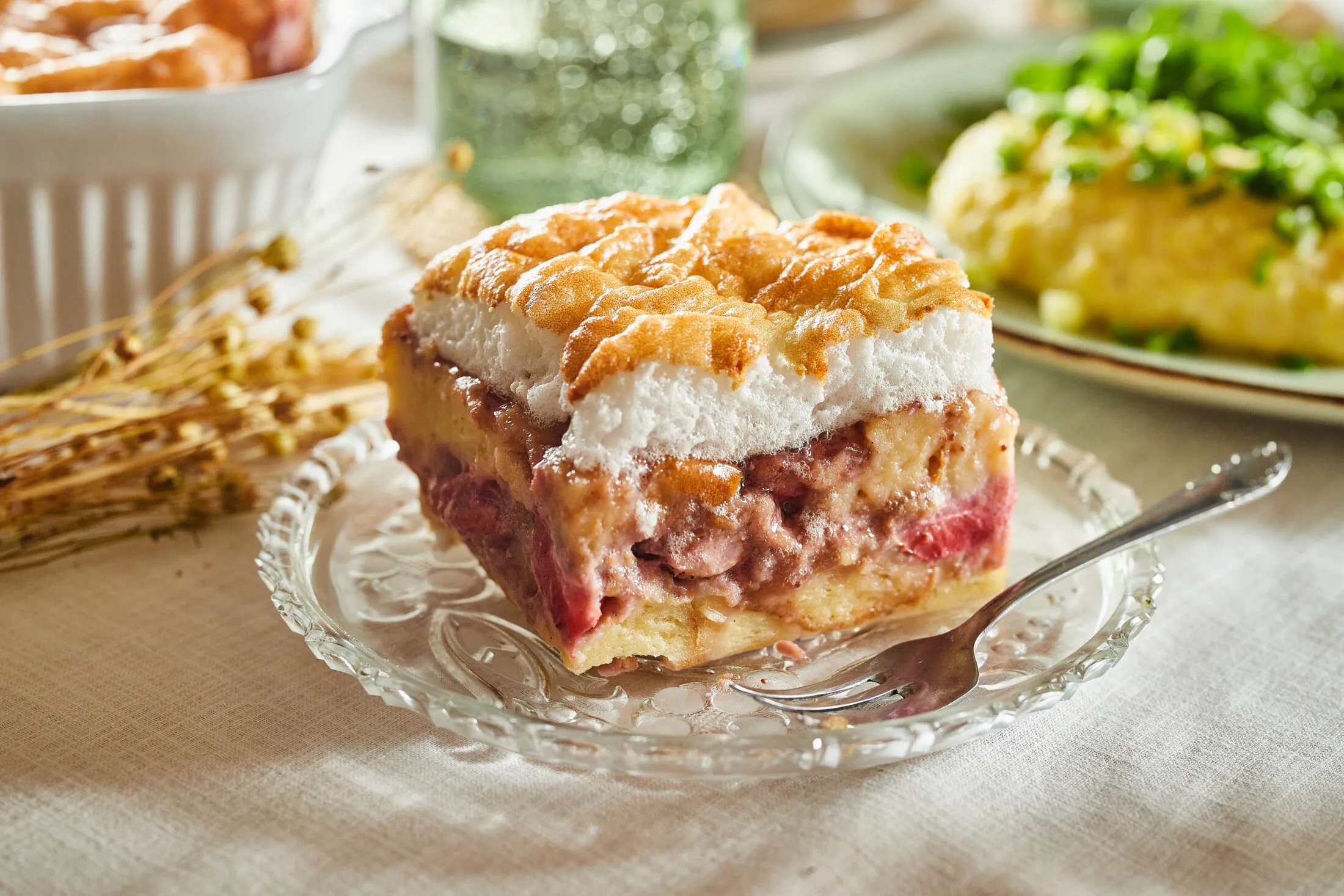 Az áztatott kalácsot kinyomkodjuk, majd a felét a vajjal kikent tepsibe rakjuk. A tetején eloszlatjuk az eperlekvár nagy részét, de 1 evőkanálnyit félreteszünk a habhoz. A lekváros réteget megszórjuk a darált dióval és rápakoljuk a feldarabolt epreket is. Jöhet rá a maradék kalács, majd az egészet 180 fokra előmelegített sütőbe rakjuk 20 percre.