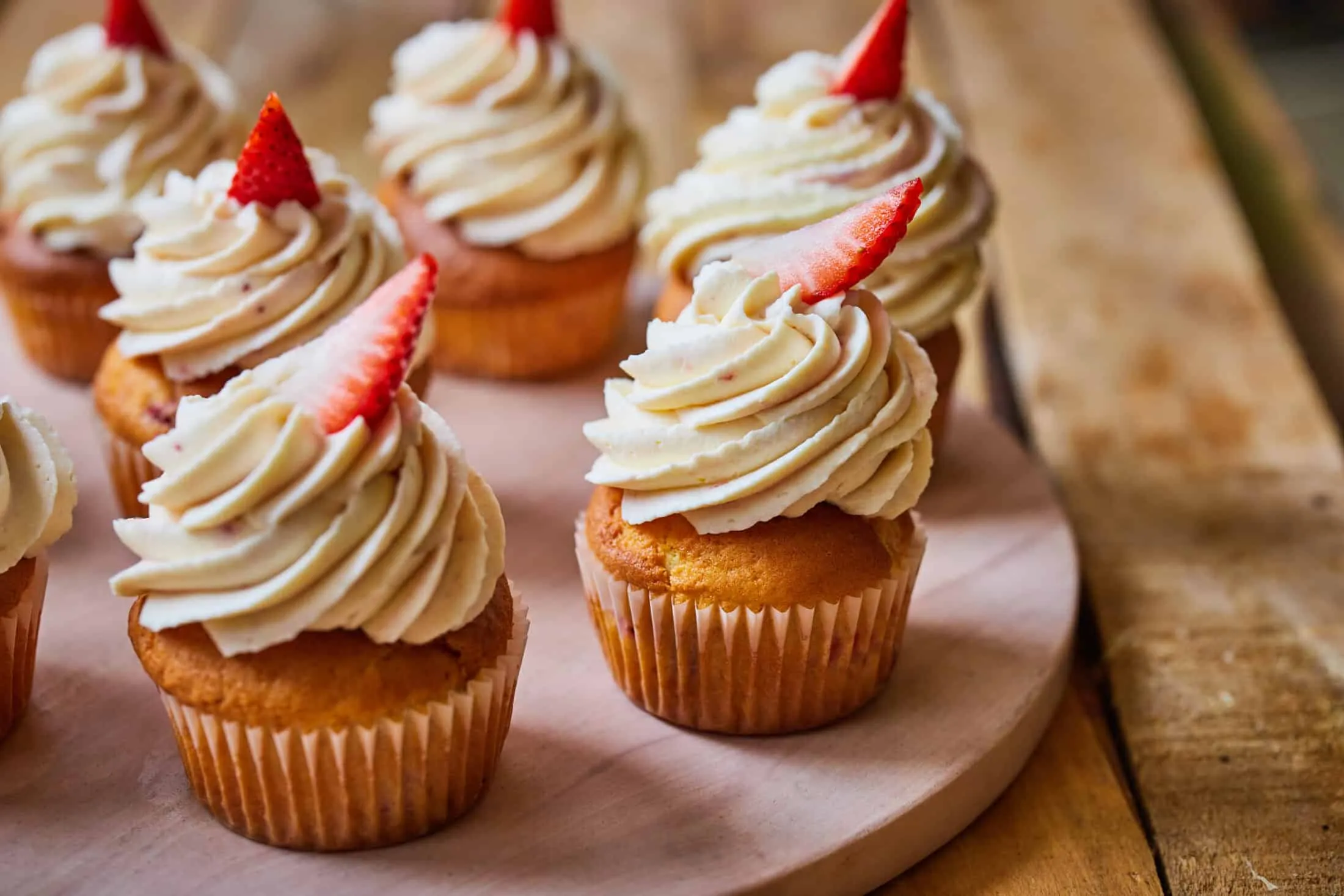 Eperdarabokkal gazdagított puha, vaníliás muffinok, a tetejükön egy szép nagy adag epres-tejszínes krémmel. Higgyétek el, mennyei!