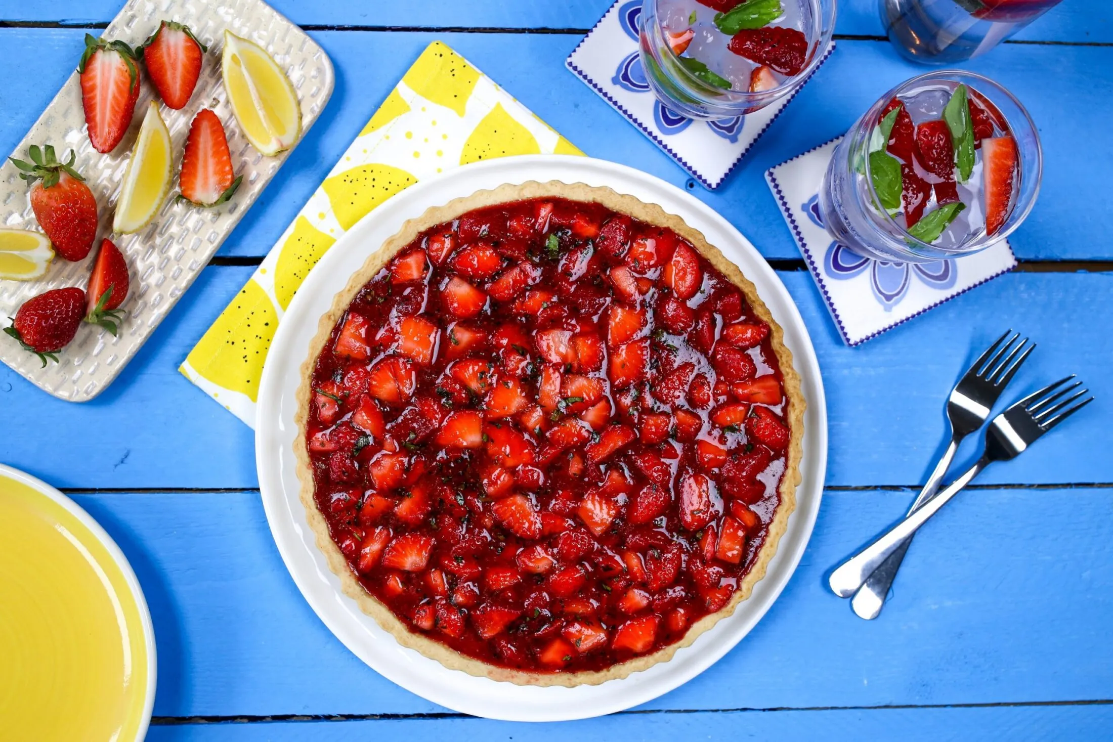 A tésztához a hideg kockára vágott vajat és a lisztet összemorzsoljuk, hozzáadjuk a cukrot és a hideg vizet, majd tésztává gyúrjuk. Lisztezett felületen kinyújtjuk, beleegyengetjük a piteformába. Kibéleljük a tésztát alufóliával és nehezéket teszünk rá (bab, lencse, stb.), 180 fokos előmelegített légkeveréses sütőben “vakon” sütjük 10 percig, majd az alufólia és nehezék nélkül további 10 percig sütjük.A töltelékhez az 500 g epret felkockázzuk, a zselatint jéghideg vízbe áztatjuk. Egy lábasba beleöntünk 300 g epret és a cukrot, majd közepes lángon addig melegítjük, amíg a cukor elolvad, ekkor botmixer segítségével pürésítjük és beleöntjük a zselatint. Forráspontig hevítjük, majd lehúzzuk a tűzről. A maradék eperhez hozzáadjuk az apróra vágott bazsalikomot, a citrom reszelt héját, levét, majd összeforgatjuk az eperpürével és beleöntjük a kisült pitetésztába. Hagyjuk kihűlni, majd hűtőbe tesszük, hogy a zselatin kifejtse hatását és tudjuk szeletelni.Tipp: Tálaljuk felvert tejszínhabbal.