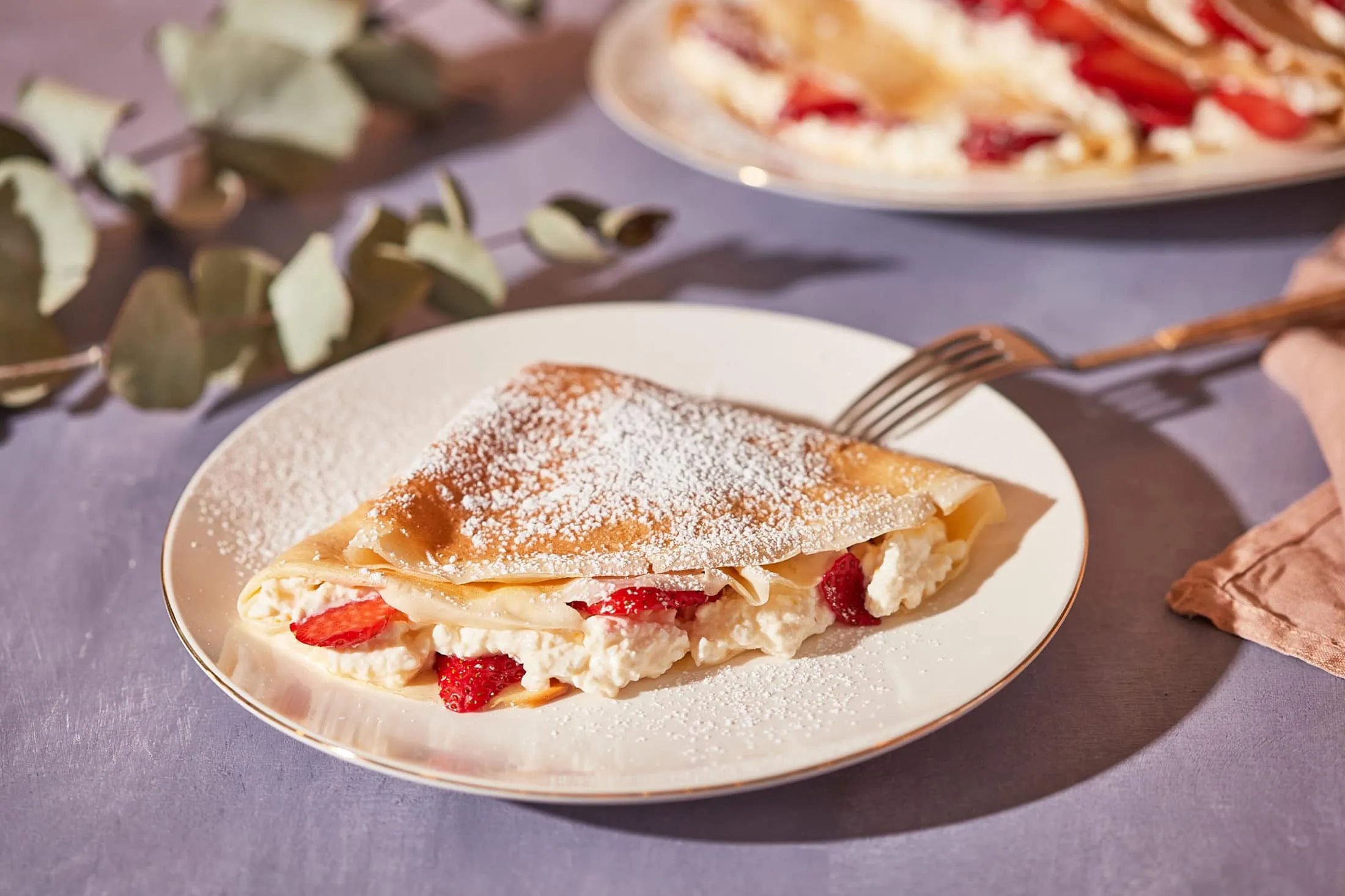 A palacsinták negyedére kenünk egy-egy adag túrókrémet, rárakosgatjuk az eperszeleteket, és négybe hajtjuk őket. Porcukorral megszórva tálaljuk.