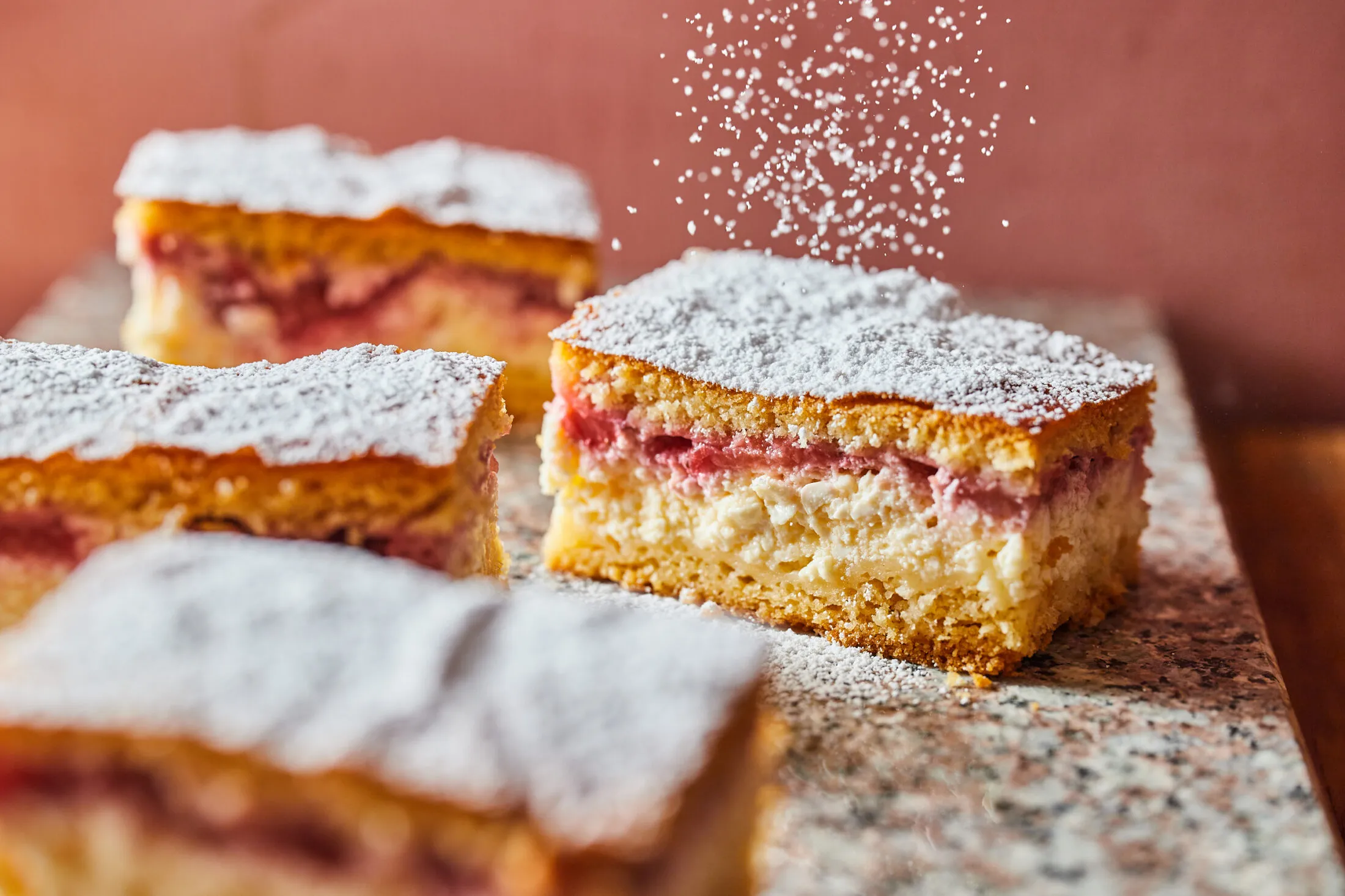 Az elősütött tésztalapra simítjuk a túrós tölteléket, majd rárakjuk az eperszeleteket. A másik tésztagombócból is két sütőpapír között a tepsi méretének megfelelő lapot nyújtunk, és ezt a töltelék tetejére helyezzük. Megszurkáljuk villával és lekenjük enyhén felvert tojással. Visszatoljuk a sütőbe és kb. 40 perc alatt aranybarnára sütjük a sütit. Szeletelés előtt mindenképpen hagyjuk kihűlni. Porcukorral megszórva tálaljuk.