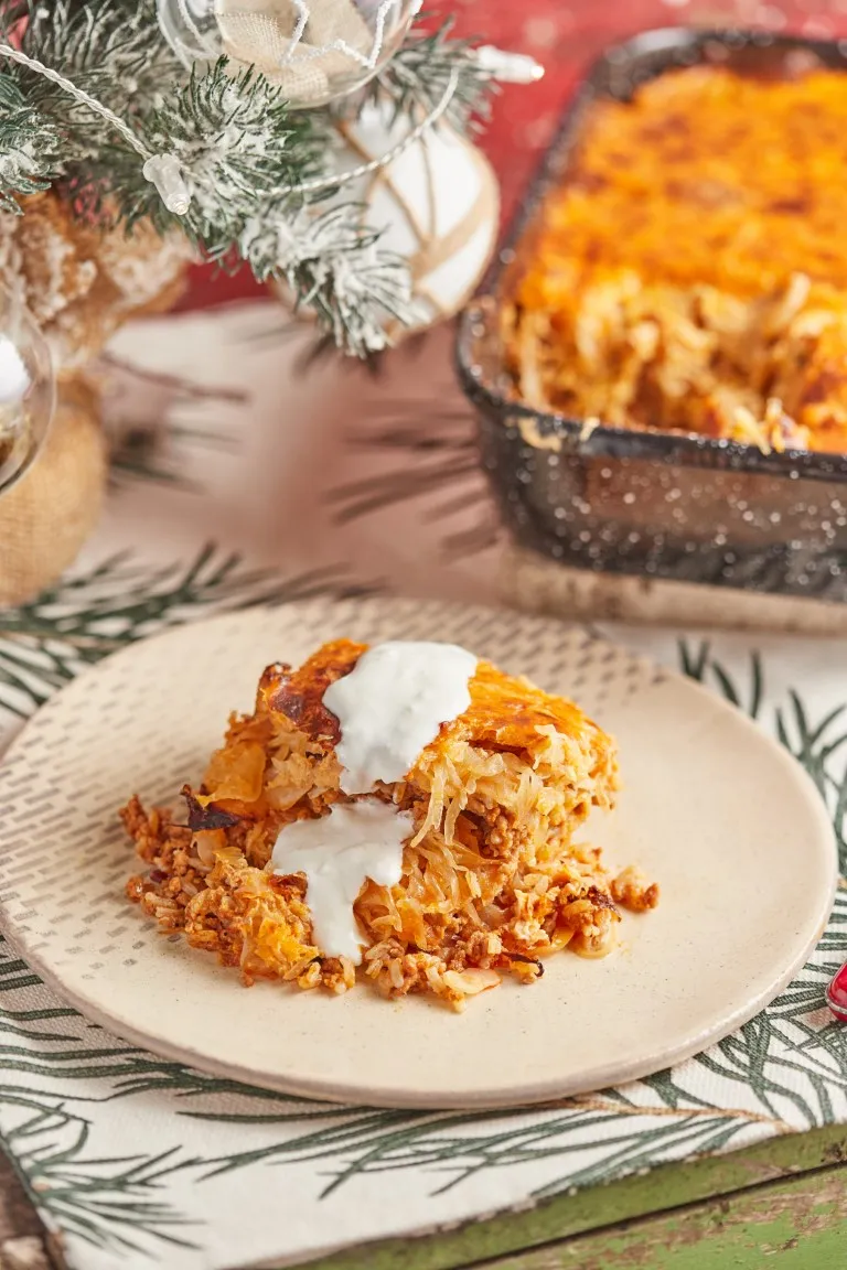 Ezután felöntjük fél deci vízzel, megszórjuk pirospaprikával, és hozzáadjuk a húst. Sózzuk, borsozzuk, megszórjuk a köménnyel, és felöntjük még 1 deci vízzel. Alacsony lángon lassan főzzük 15 percig. Amikor a húsos ragu készen van, összekeverjük a rizzsel. Egy magas falú tepsi aljára tesszük a káposzta ⅓ részét, rá a hús felét, arra jöhet a maradék káposzta fele, a hús másik fele, majd maradék káposzta.
