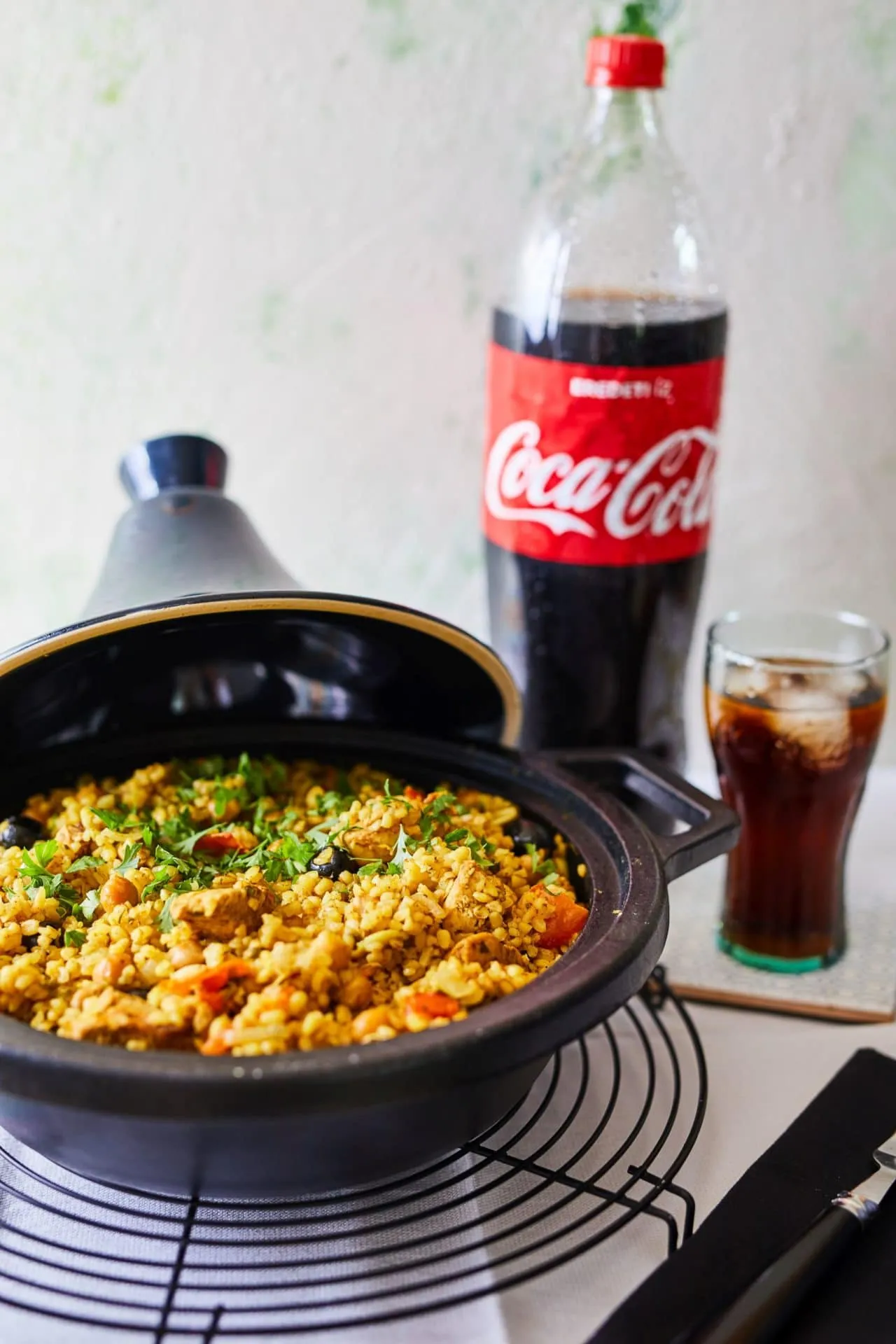 Az olajon elkezdjük pirítani a felkockázott csirkemellet, rászórjuk a fűszereket, sózzuk, borsozzuk. Rárakjuk az apróra vágott hagymát és a felszeletelt fokhagymát, a felaprított, sóban eltett citrom héját, a felkockázott paradicsomot, az olajbogyót, egy kevés chilit és a csicseriborsót. Az egészet jól összeforgatjuk.