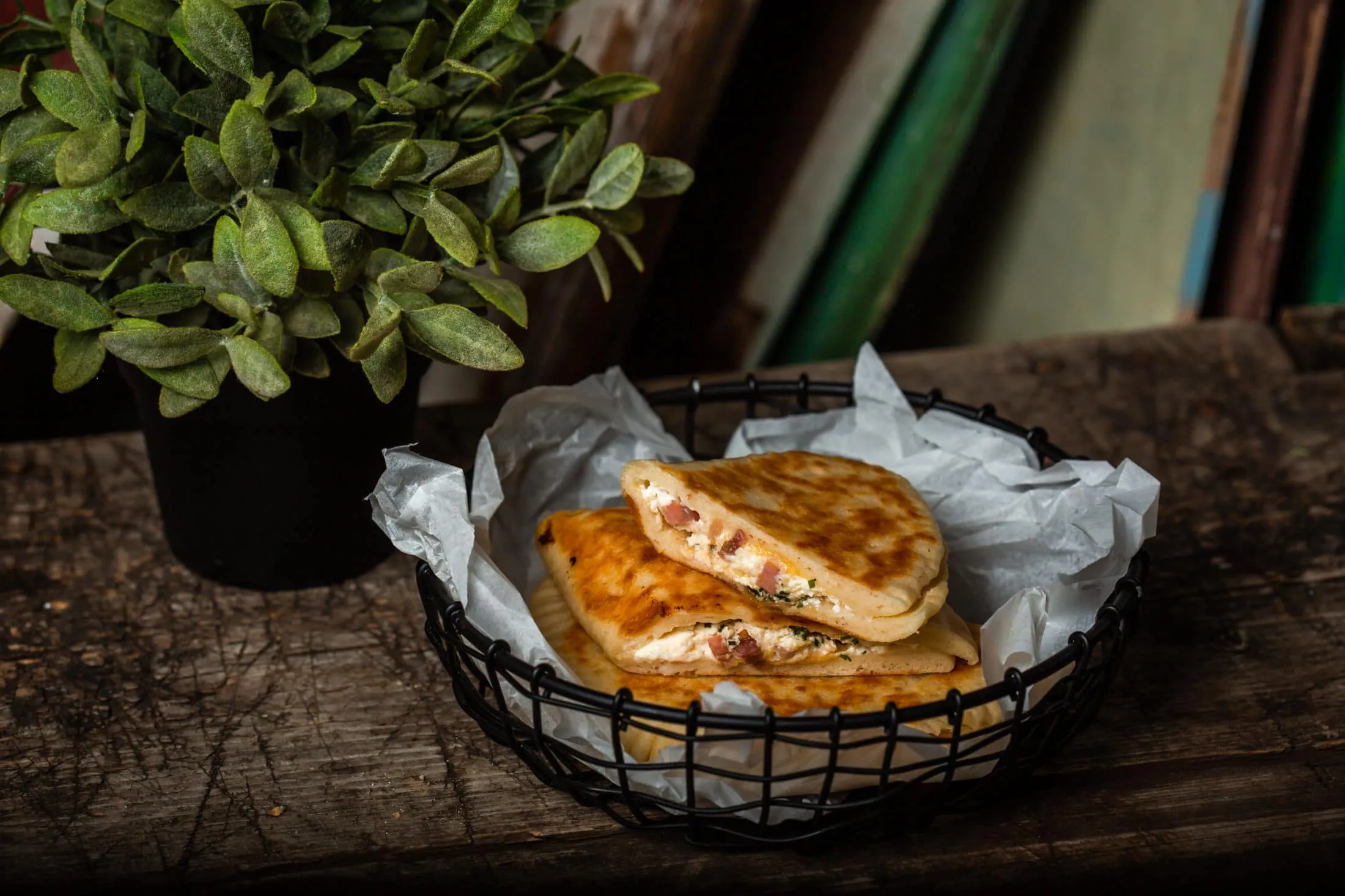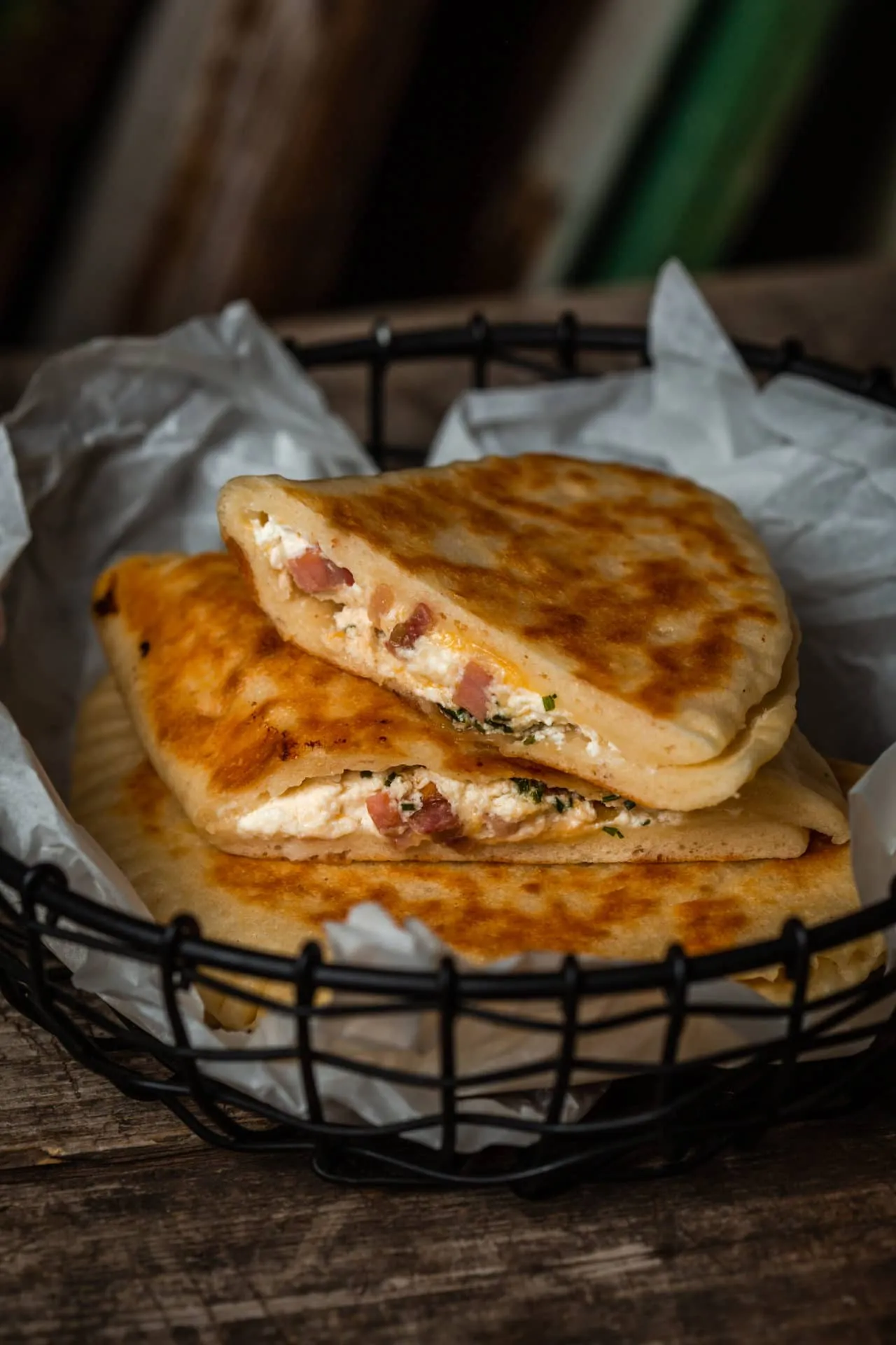 Az eddig pihentetett tésztát 6 db egyenlő részre osztjuk, kis bucikat formázunk belőle, majd vagy nyújtófával, vagy csak kézzel vékony, ovális alakúra nyújtjuk. Az egyik felére szedünk a tejfölből, rászórjuk a sajt és a szalonna egyhatod részét, beletesszük a finomra vágott snidling egyhatod részét is, majd ráhajtjuk a másik felét, és kézzel vagy egy villával összenyomkodjuk, nehogy kifolyjon az olvadó sajt.