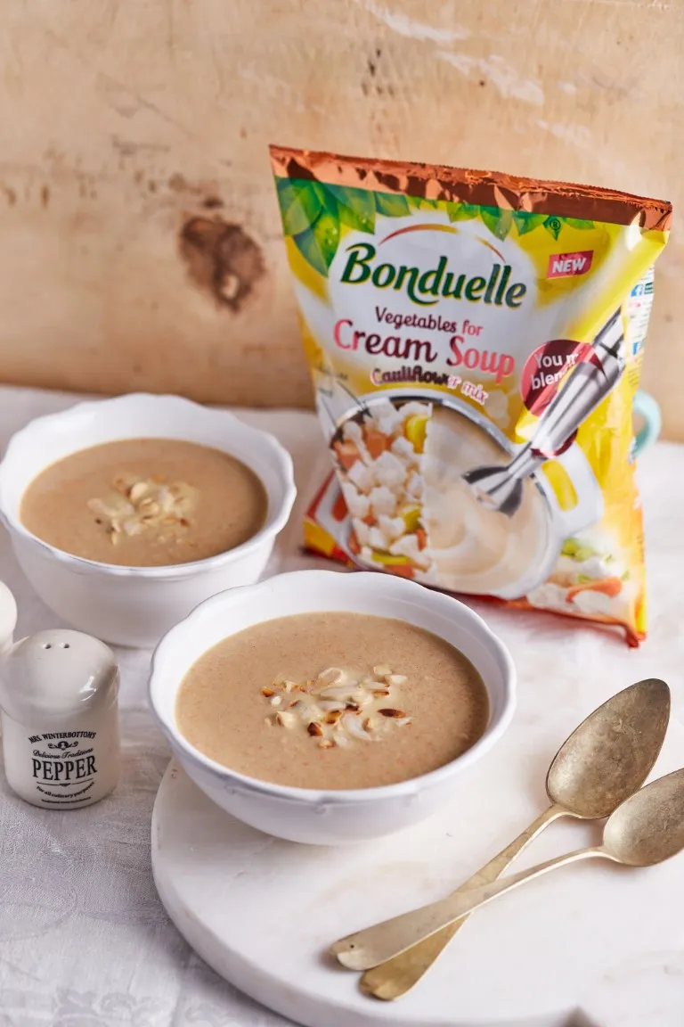 Egy lábasban felmelegítjük az olívaolajat, majd rádobjuk az apróra vágott vöröshagymát, fokhagymát. Sózzuk, borsozzuk és üvegesre pirítjuk. Beleszórjuk a karfiol mixet, a fahéjat, majd felöntjük a vízzel, tejszínnel és 8-10 percig főzzük. Botmixerrel krémesre pürésítjük. Száraz serpenyőben pirított mandulával megszórva tálaljuk a levest.