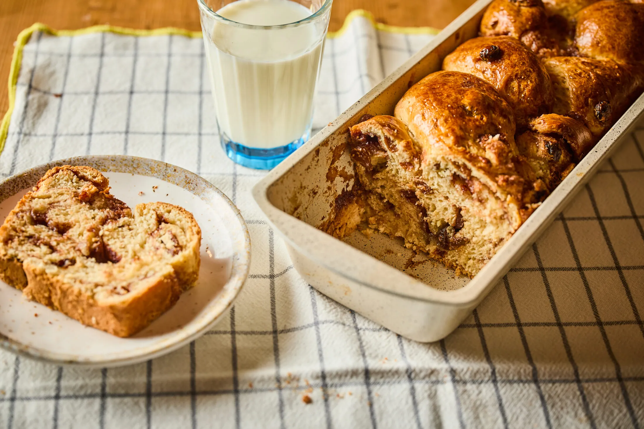 A tésztát 3 részre osztjuk, kinyújtjuk őket, megkenjük a fahéjas-vajas töltelékkel és rúddá tekerjük őket. Az így kapott 3 rudat összefonjuk, és egy alulról sütőpapírral bélelt kenyérsütő formába rakjuk. Letakarjuk, és 20 percig hagyjuk kelni, majd lekenjük a tetejét a tejjel vagy tejszínnel elkevert tojássárgájával, betoljuk az előmelegített, 175 fokos sütőbe, és kb. 45 perc alatt megsütjük.