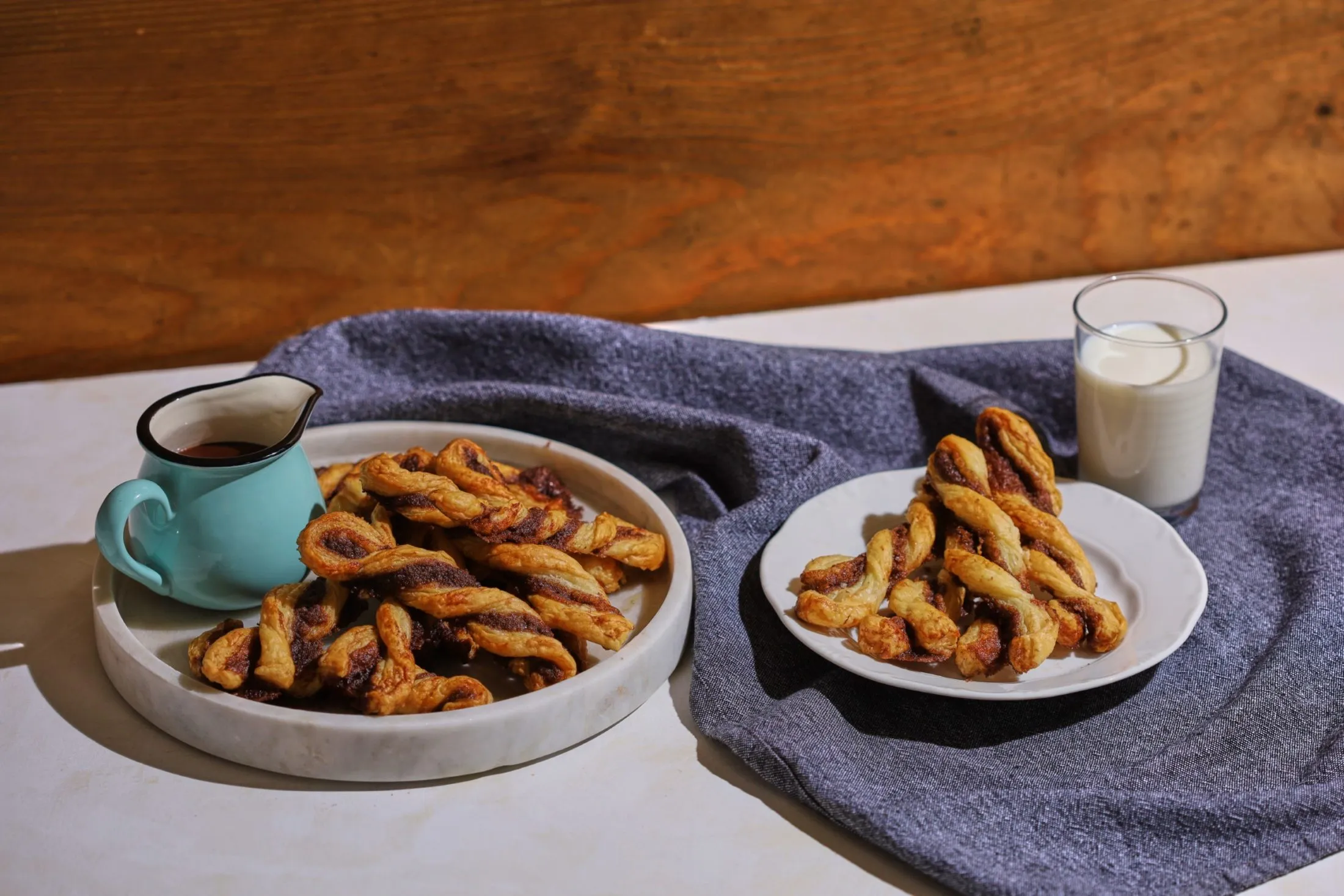 A leveles tésztát széthajtjuk, és az alsó felét megkenjük a masszánkkal. A felső részét ráhajtjuk, és a tészta széleit összenyomkodjuk. Egy kés vagy pizzavágó segítségével ujjnyi vastag csíkokat vágunk, amiket két végüknél megcsavarunk, és szilikonos sütőpapírral bélelt tepsire teszünk.