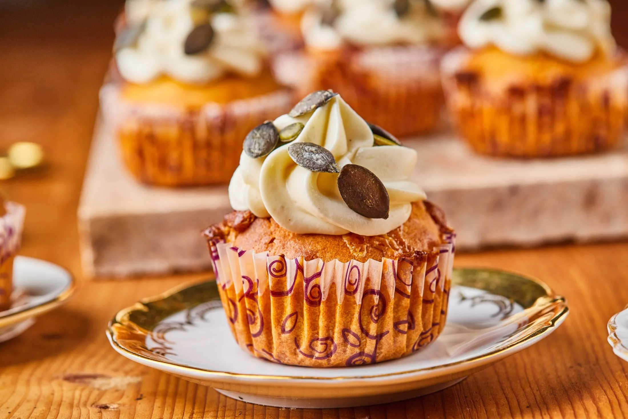 A krémhez a csokit vízgőz felett felolvasztjuk, majd hagyjuk kihűlni. A mascarponét 3-4 percig habosítjuk, majd beletesszük a kihűlt fehér csokit, a tejszínt és a fahéjat, és tovább habosítjuk egy kicsit. Egy habzsákból a kihűlt muffinok tetejére nyomjuk a krémet, megszórjuk a tökmaggal, és kész is.