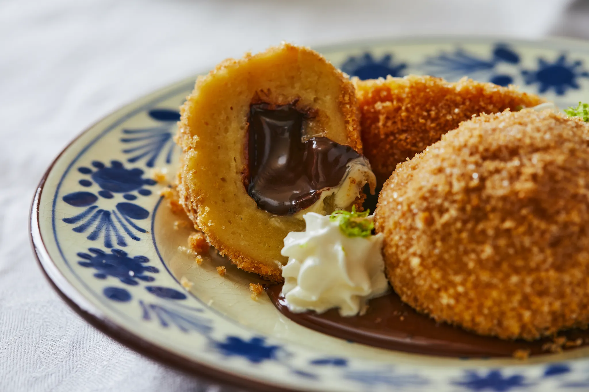 A megfőtt gombócokat meghempergetjük a zsemlemorzsában, és már tálalhatunk is. A tányér aljára kanalazunk az öntetből, rárakjuk a gombócokat, habzsákból vagy kanállal teszünk a tejfölből is a gombócok mellé, és frissen reszelt lime-héjjal díszítjük.