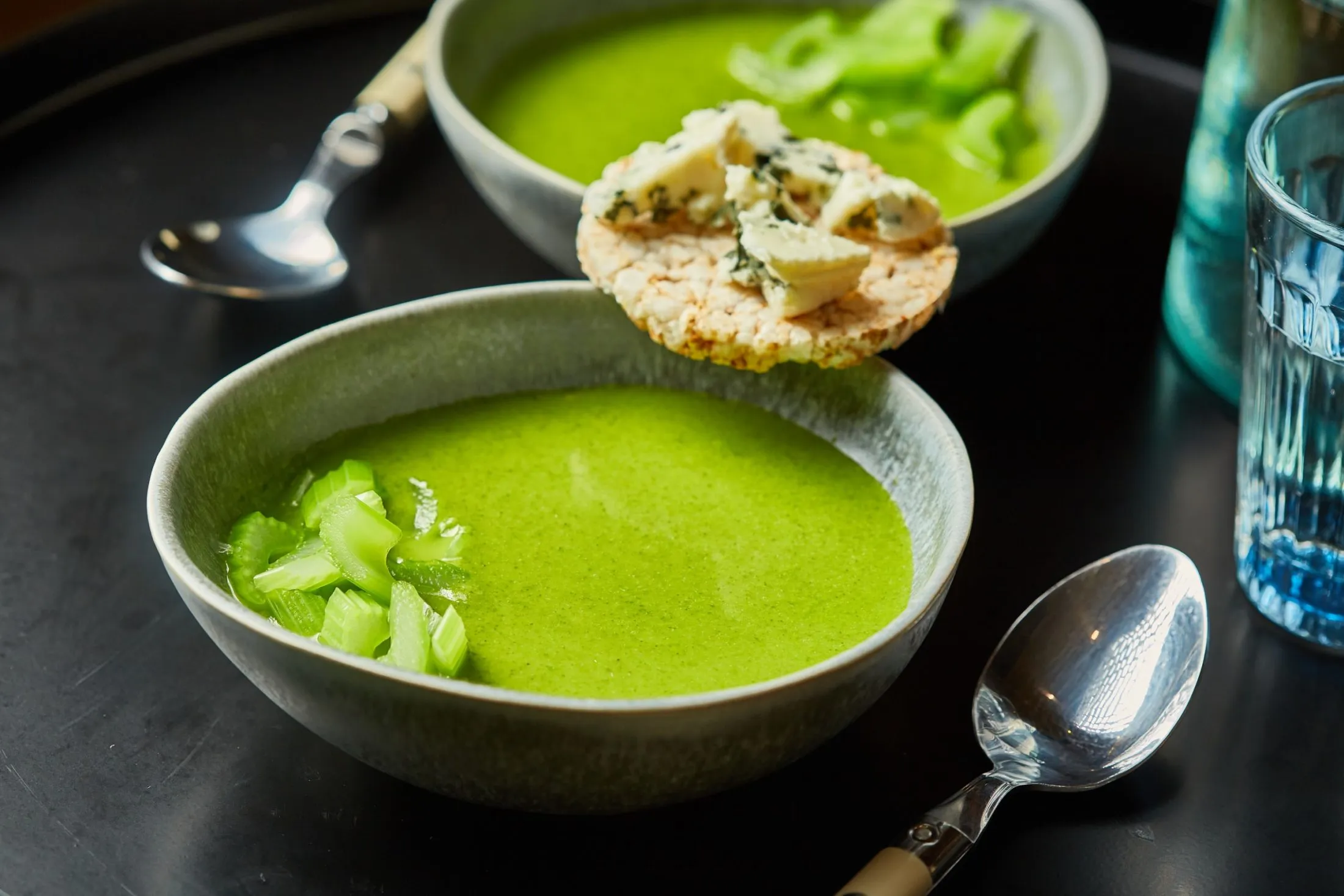 A felszeletelt szárzellert lobogó, sós vízbe dobjuk 2 percre, majd jeges vízben sokkoljuk. A levesbe teszünk a szárzellerből és a kéksajtos puffasztott rizzsel fogyasztjuk.
