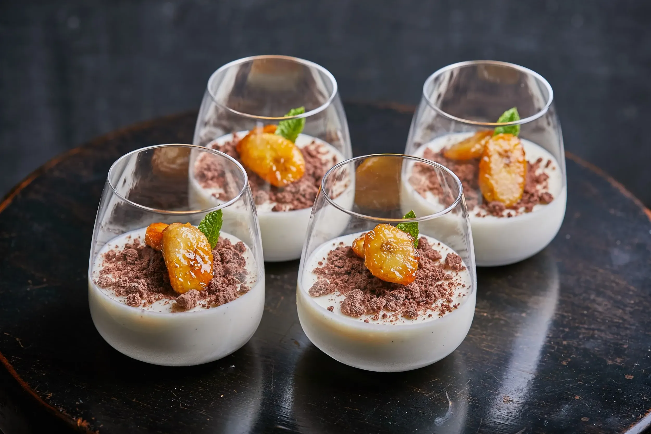 1-2 percig rázogatjuk, hogy bevonja a karamell a banánokat, majd félrerakjuk. A mousse tetejére szórunk egy adag kekszmorzsát, majd 2-3 banánkarikával díszítjük a poharakat.