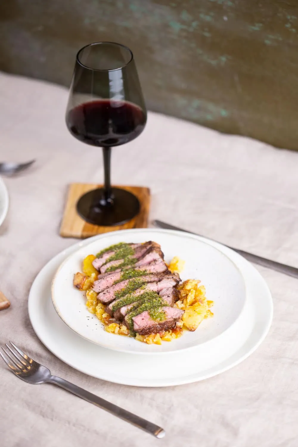 A krumplipürét a felszeletelt steakkel és a pesztóval meglocsolva tálaljuk.