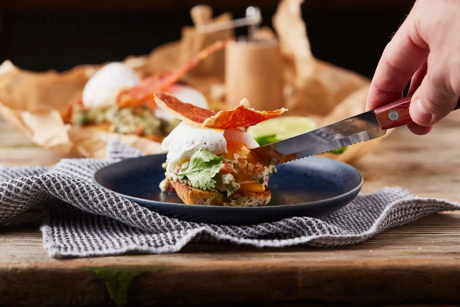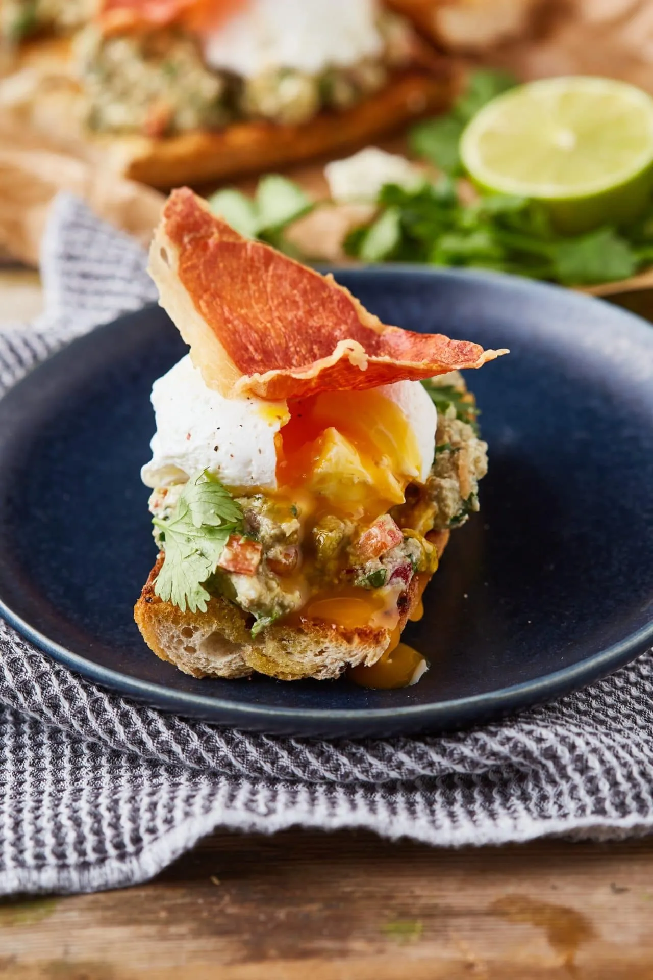 A sonkákat 2 papírtörlő között a mikróba helyezzük 3-4 percre. A bagettből vagy ciabattából pirítóst csinálunk, megkenjük az avokádókrémmel, ráhelyezzük a tojást és a serranoropogóst, és fogyasztjuk.