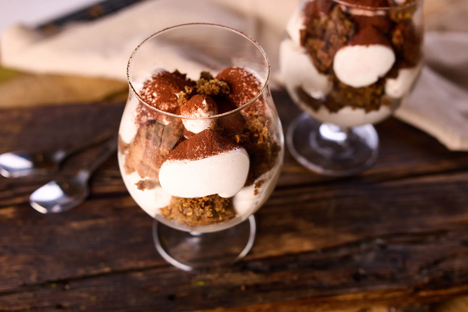 A fitt tiramisu-pohárkrém elkészítését azzal kezdjük, hogy a krémhez tartozó hozzávalókat egy robotgépben addig habosítjuk, amíg stabil állagot nem kapunk, majd habzsákba töltjük, és amíg elkészítjük a tésztát, hűtőbe tesszük pihenni.