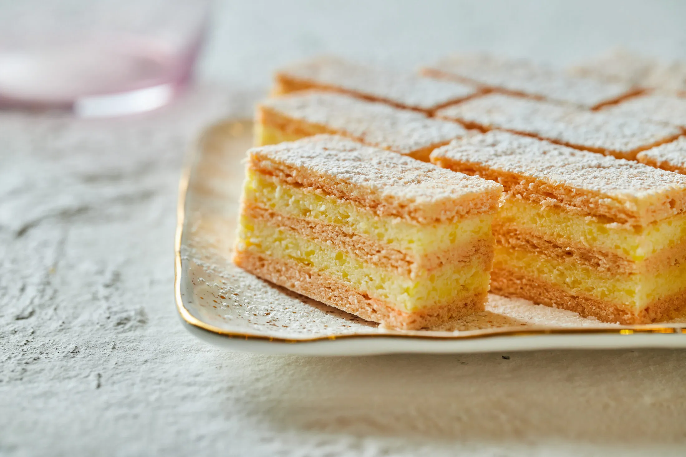 Az egyik lapot megkenjük a krém felével, erre jön a másik lap, a krém másik fele, majd a harmadikkal lezárjuk a sütit. Rakunk rá egy fóliát és a tetejére egy vágódeszkát, és picit súllyal (kb. 500 g) lenyomjuk, csak hogy szép egyenes legyen a teteje, de vigyázzunk, hogy ne nyomjuk ki a krémet a rétegek közül. Egy éjszakára a hűtőbe rakjuk pihenni, másnap pedig szeletelhetjük is, végül minden szeletet megszórunk porcukorral.